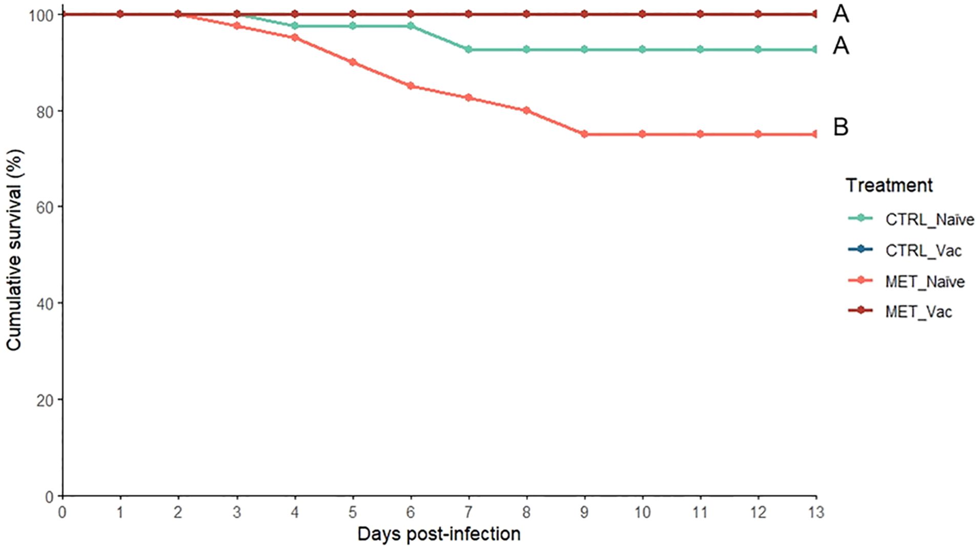 Figure 2. Cumulative survival of rainbow trout intraperitoneally infected with Y. ruckeri (5 × 105 CFU/mL) following 7 weeks (4 weeks before vaccination and 3 weeks post-vaccination) of feeding with CTRL or MET diet (n = 40). Sham-infected fish are not shown for the clarity of the graph. Different letters denote differences across experimental groups (Fisher’s exact test; p ≤ 0.05).