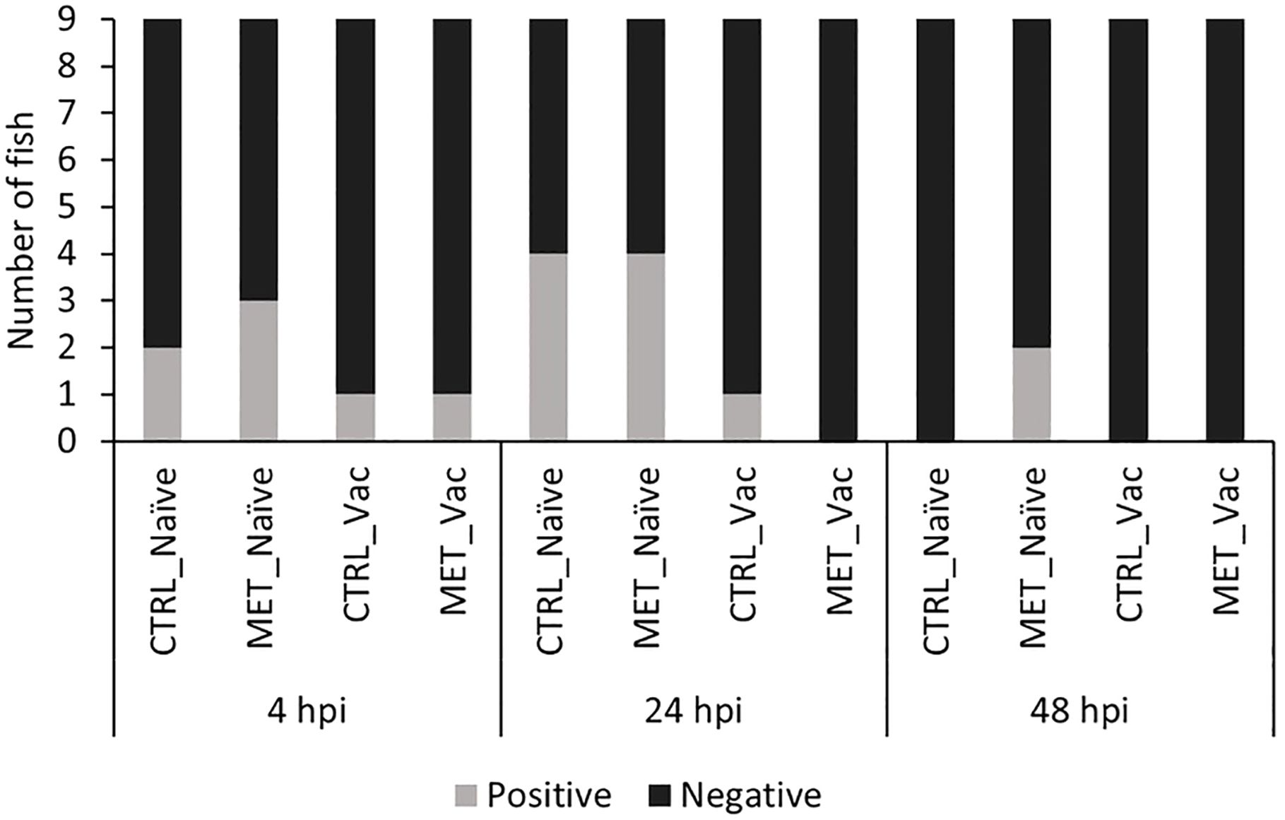 Prior to infection, Y. ruckeri was not detected in any experimental group (data not shown). Following infection, the number of fish carrying detectable bacteria in at least one analyzed tissue was higher in the MET-naïve group than in both vaccinated groups, although it did not significantly differ from the CTRL-naïve group (Supplementary File S1; Supplementary Table S7). While no statistically significant differences in bacterial prevalence were observed among groups when analyzed at individual time points (Supplementary File S1; Supplementary Table S8), at 48 hpi, the MET-naïve group was the only one in which Y. ruckeri-positive fish were still detected (Figure 3). The number of gills, posterior gut and spleen samples testing positive for Y. ruckeri is provided in Supplementary File S1; Supplementary Figure S1.