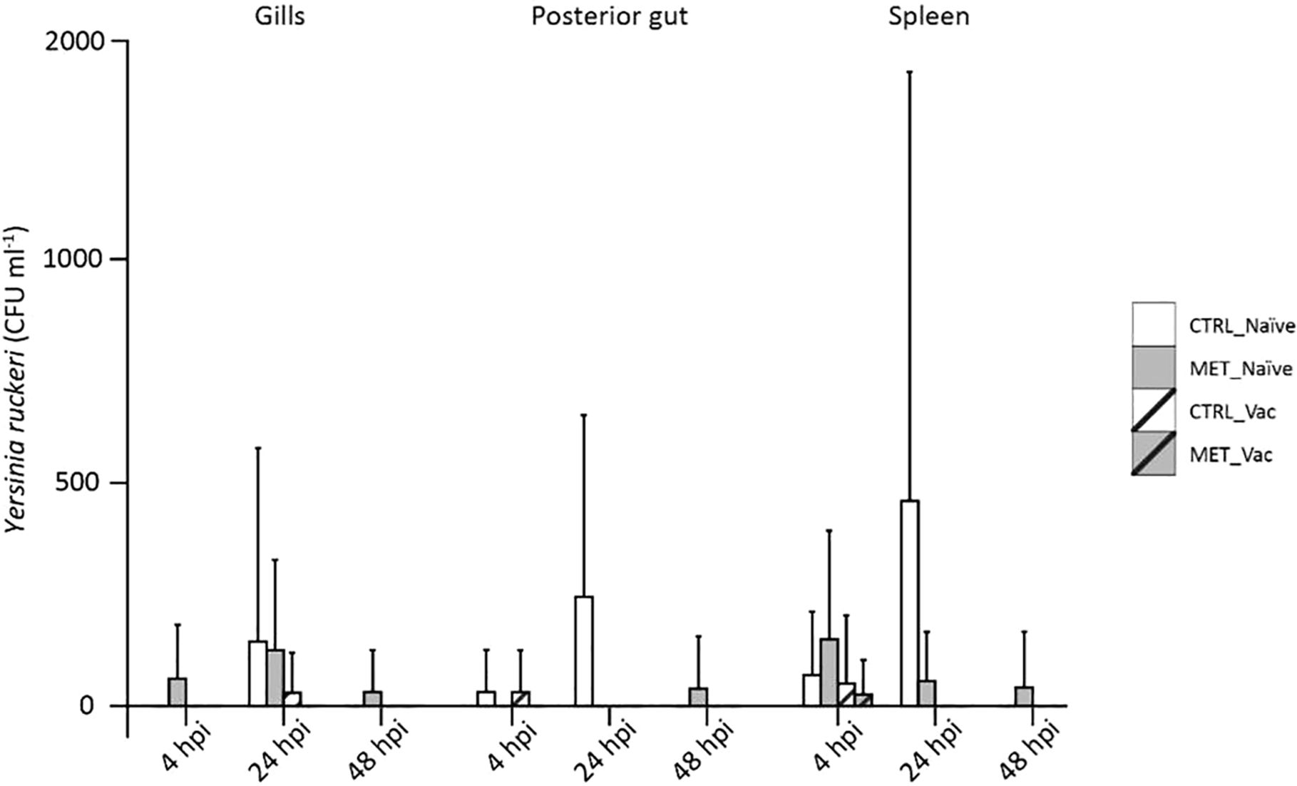 Figure 4. Concentration of Y. ruckeri in the gills, posterior gut and spleen of rainbow trout at 4, 24 and 48 h post-infection following 7 weeks (4 weeks before vaccination and 3 weeks post-vaccination) of feeding with CTRL or MET diets. Bacterial load is expressed as the mean concentration (CFU/mL) and standard deviation for each tissue and treatment group (n = 9).
