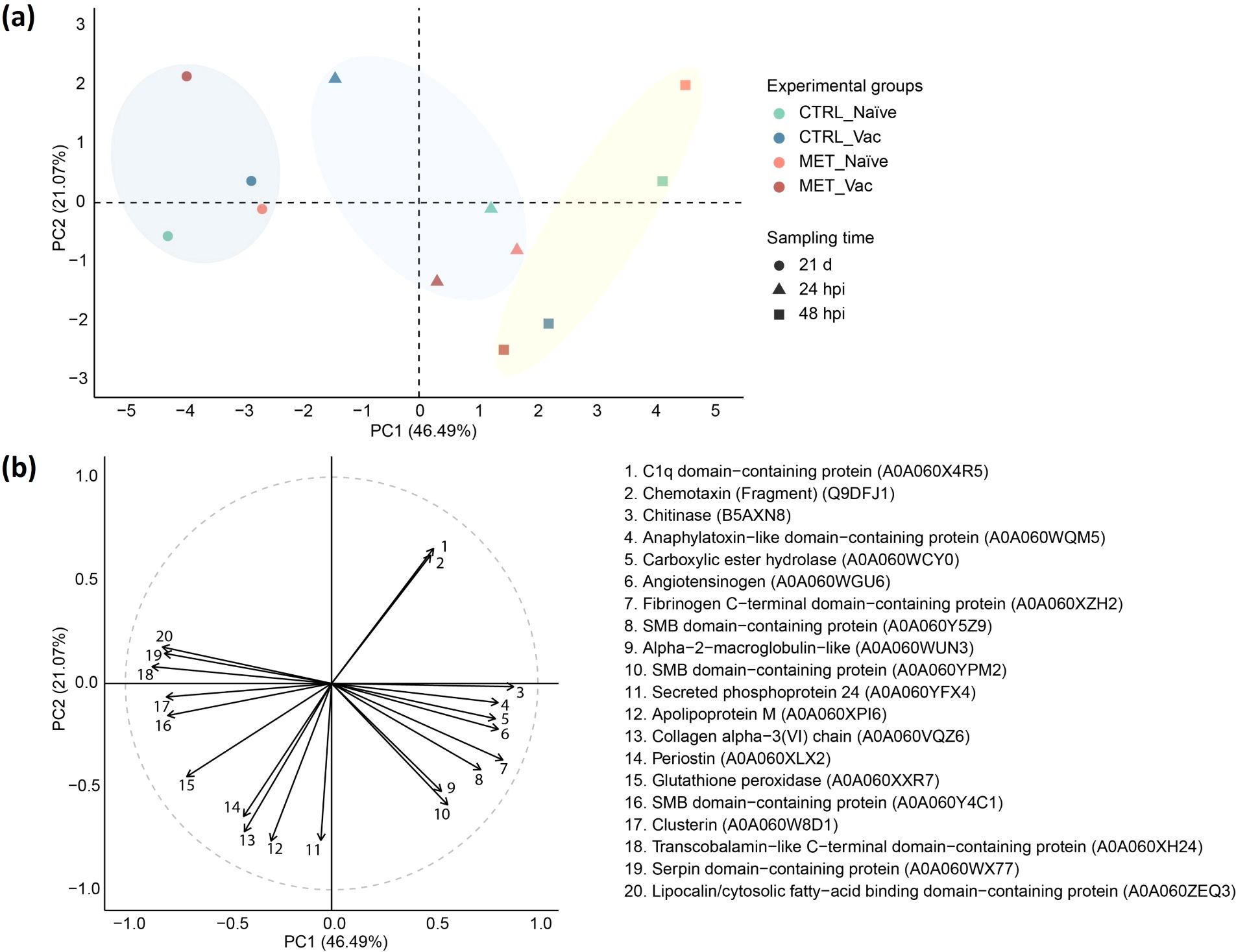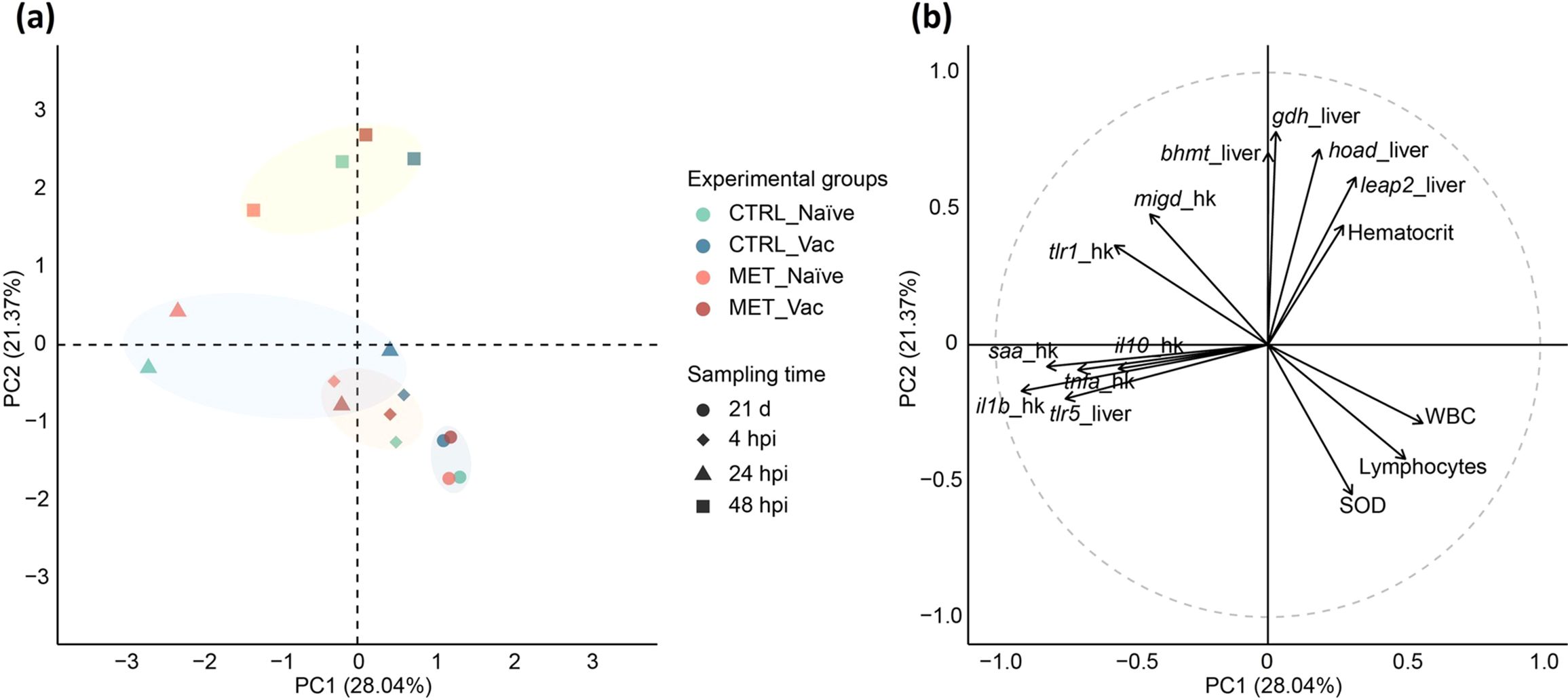 Figure 5. Principal component analysis integrating results from hematology, hepatic antioxidant capacity and gene expression analysis in the head-kidney and liver of rainbow trout fed different dietary treatments (CTRL or MET) for 7 weeks (4 weeks before vaccination and 3 weeks post-vaccination), evaluated at 21 days post-vaccination (21d), and at 4, 24 and 48 hpi. (a) PCA plot with centroid scores for each experimental group. (b) Correlation circle plot displaying the variables most strongly correlated with the first two principal components (PC1 and PC2).