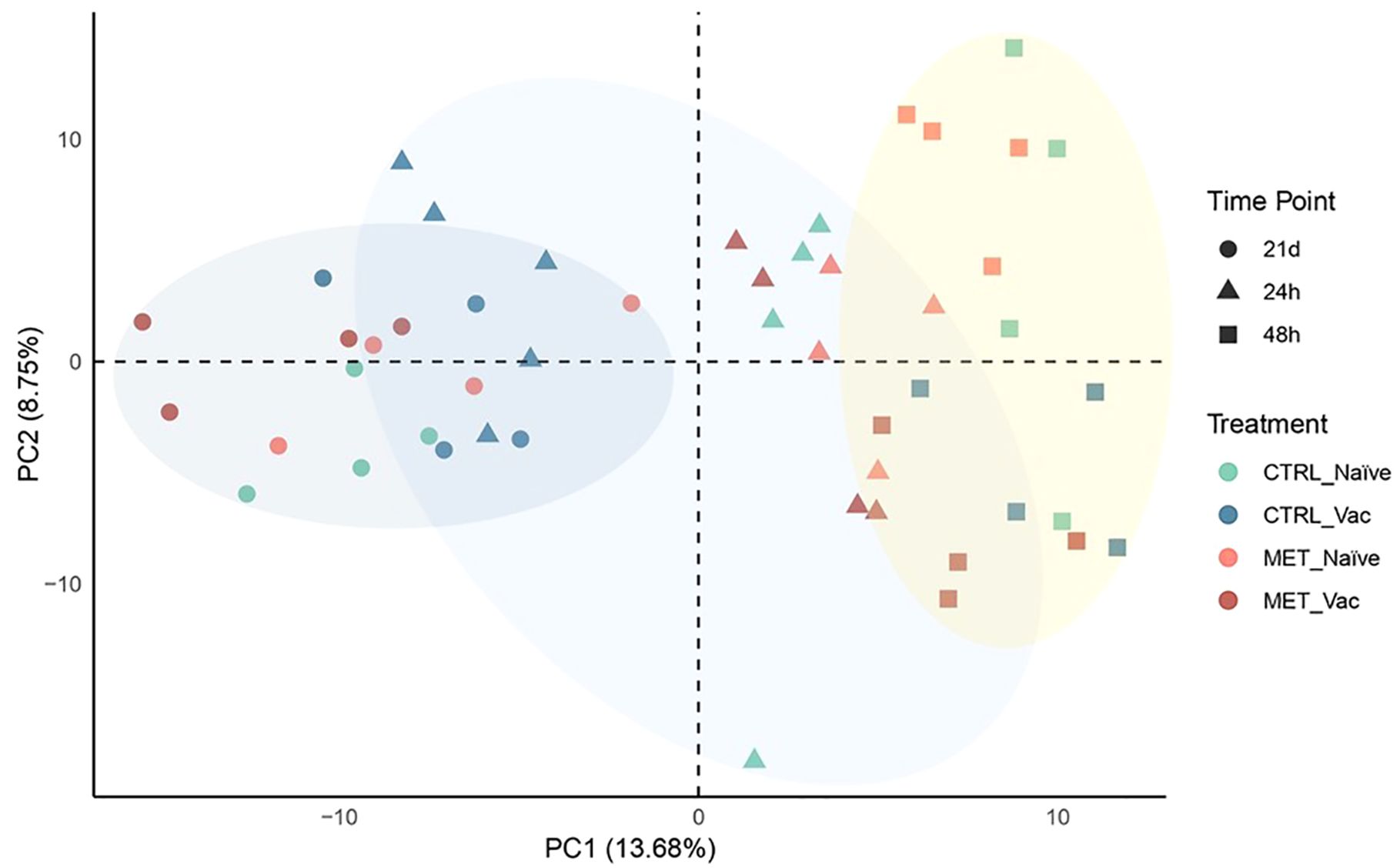 After the 7-week feeding period (21d post-vaccination), only a few differences were detected across experimental groups. Vaccinated fish showed higher MCV levels and lower cd8b expression levels in the head-kidney compared to naïve fish (Supplementary File S1; Supplementary Tables S1, S6, respectively). In addition, MET-fed fish exhibited significantly lower hepatic mRNA expression of amd1 than CTRL-fed fish, regardless of vaccination status (Supplementary File S1; Supplementary Table S5). No other differences were detected in the hematological profile or differential leukocyte counts across experimental groups (Supplementary File S1; Supplementary Tables S1, S2). Similarly, hepatic metabolites levels (Supplementary File S1; Supplementary Table S3) and antioxidant capacity (Supplementary File S1; Supplementary Table S4) did not differ significantly among groups.