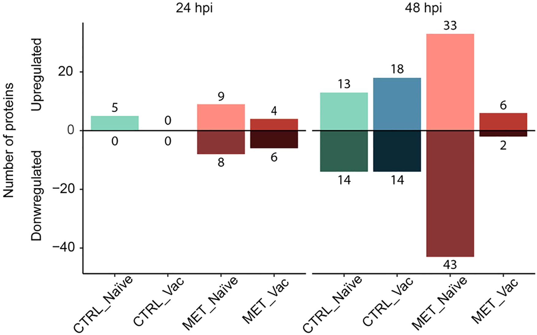 Data were imported into Perseus (v2.1.3.0), missing values were imputed from a normal distribution to simulate signals of low-abundant proteins and principal component analysis (PCA) was performed to visualize the distribution of samples. With the exception of the CTRL vaccinated group at 24 hpi, one sample was removed from each of the other treatment groups. After outlier exclusion, data were log2-transformed and two-sample t-tests [Student’s t-test with Benjamini-Hochberg correction (FDR = 0.05)] were conducted to compare all experimental groups with the CTRL naïve group before infection, which was used as a common reference. Proteins with an adjusted p-value (padj) < 0.05 were considered differentially abundant proteins (DAPs).