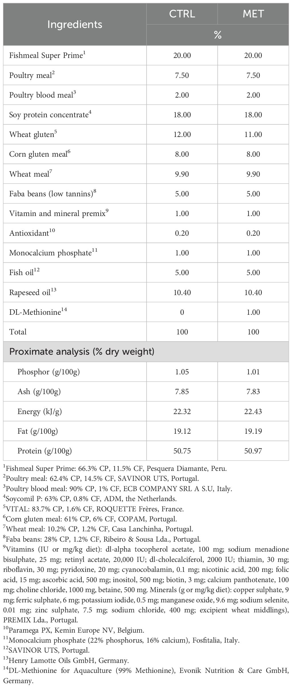Juvenile rainbow trout were transferred from a commercial fish farm (Serra de Aire, Portugal) to the CIIMAR facilities (Portugal), where they were housed for a period of eight weeks in a 2,000 L tank at 16°C and fed the CTRL diet twice a day at a rate of 4% body weight. After this period, a total of 1,120 fish (5.9 ± 0.9 g) were evenly distributed across 32 tanks (n = 35) of 60 L, within a semi-open recirculating freshwater system (water renewal rate: 60 L/h; temperature: 14 ± 0.5°C; pH: 6.99 ± 0.18; dissolved oxygen: 7.46 ± 0.54 mg/L; photoperiod: 12 h light/12 h dark). Following a three-week acclimation period, the feeding trial began with half of the tanks receiving the MET diet, while the other half continued on the CTRL diet. The feeding trial lasted four weeks, with fish being fed twice daily at a rate of 3% of their body weight (Figure 1).