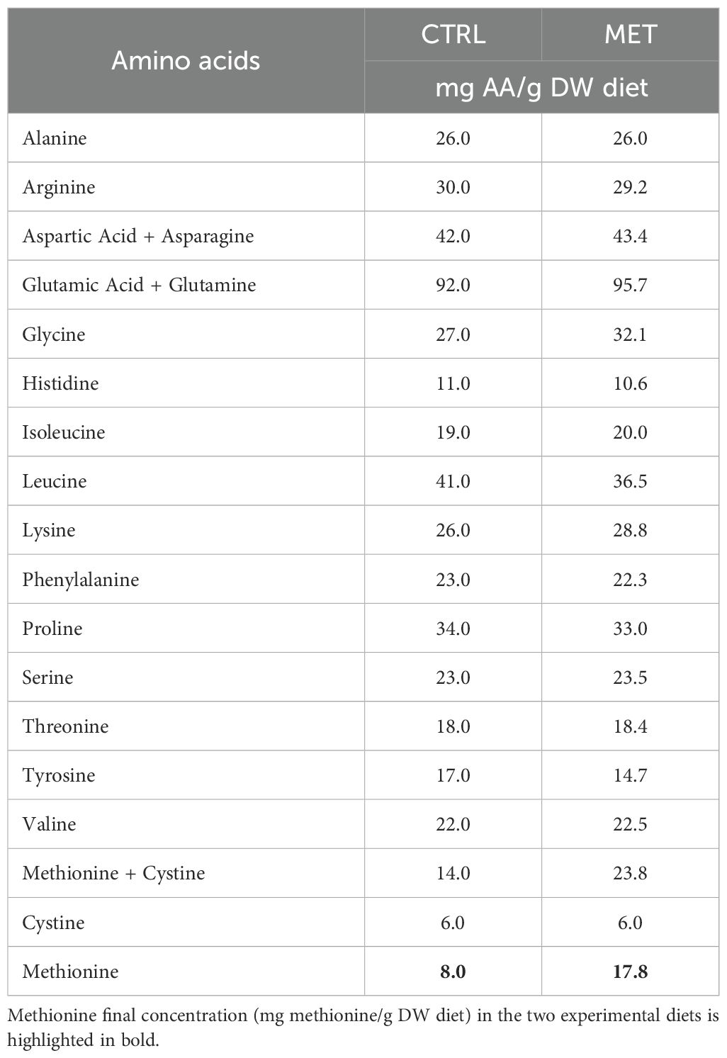 Two diets differing in methionine content were formulated and manufactured by SPAROS Lda. (Olhão, Portugal) (Table 1). The control (CTRL) diet was designed to meet the indispensable amino acid requirements for rainbow trout (32) and, the second diet was identical to the CTRL diet but supplemented with DL-methionine (MET) at the expense of wheat gluten. Methionine concentrations in the CTRL and MET diets were 8 mg and 17.8 mg per gram of dry matter, respectively (Table 2). The methionine level in the MET diet was within the range previously reported to enhance immune function in rainbow trout (14).
