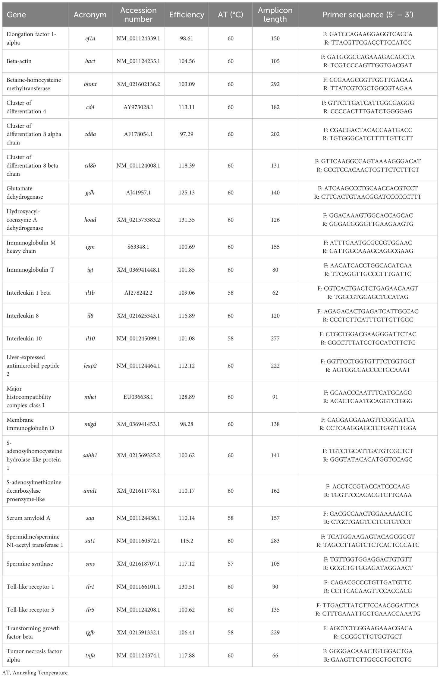 Total RNA was extracted from liver and head-kidney using the Maxwell® RSC simplyRNA Tissue Kit (Promega Corporation) according to the manufacturer’s specifications. RNA concentration was quantified with a DS-11 FX spectrophotometer (DeNovix). First-strand complementary DNA (cDNA) was synthesized using the NZY First-Strand cDNA Synthesis Kit (NZYTech), with reactions performed on a Veriti DX 96-well Thermal Cycler (Applied Biosystems). Quantitative real-time PCR (qPCR) was conducted using a CFX384 Touch Real-Time PCR Detection System (Biorad). Reactions were prepared in a final volume of 10 µL, containing 4.4 µL of diluted cDNA, 5 µL of NZYSupreme qPCR Green Master Mix (NZYtech) and 0.3 µL (10 µM) of each primer. The reactions were set up in 384-well plates. Primers were designed with NCBI Primer-BLAST Tool, adhering to standard qPCR design criteria. Primer efficiency was determined using serial 2-fold dilutions of randomly pooled cDNA by calculating the slope of the regression line of the Ct values. Melting curve analysis was performed to ensure the absence of primer dimers. Standard cycling conditions included an initial denaturation at 95°C for 10 min, followed by 40 cycles of denaturation at 95°C for 15 s, annealing at the primer-specific temperature for 1 min and extension at 72°C for 1 min. All reactions were run in duplicate and gene expression levels were normalized using the geometric mean of elongation factor 1-alpha (ef1a) and beta-actin (bact) and calculated according to Pfaffl method (43). A set of primers was designed to target genes involved in different biological processes, including the methionine-cycle (betaine-homocysteine methyltransferase [bhmt], S-adenosylhomocysteine hydrolase-like protein 1 [sahh1], S-adenosylmethionine decarboxylase proenzyme-like [amd1], spermidine/spermine N1-acetyl transferase 1 [sat1] and spermine synthase [sms]), energy metabolism (glutamate dehydrogenase [gdh] and hydroxyacyl-coenzyme A dehydrogenase [hoad]), innate immunity and inflammation (interleukins 1 beta [il1b], 8 [il8] and 10 [il10], liver-expressed antimicrobial peptide 2 [leap2], serum amyloid A [saa], toll-like receptors 1 [tlr1] and 5 [tlr5], transforming growth factor beta [tgfb] and tumor necrosis factor alpha [tnfa]), T cells markers (clusters of differentiation 4 [cd4], 8 alpha chain [cd8a] and 8 beta chain [cd8b], and major histocompatibility complex class I [mhci]) and antibody markers (immunoglobulins M heavy chain [igm], immunoglobulin T [igt] and membrane immunoglobulin D [igd]). Detailed information on primer sequences, amplification efficiencies, annealing temperatures, amplicon lengths, and accession numbers is provided in Table 3.