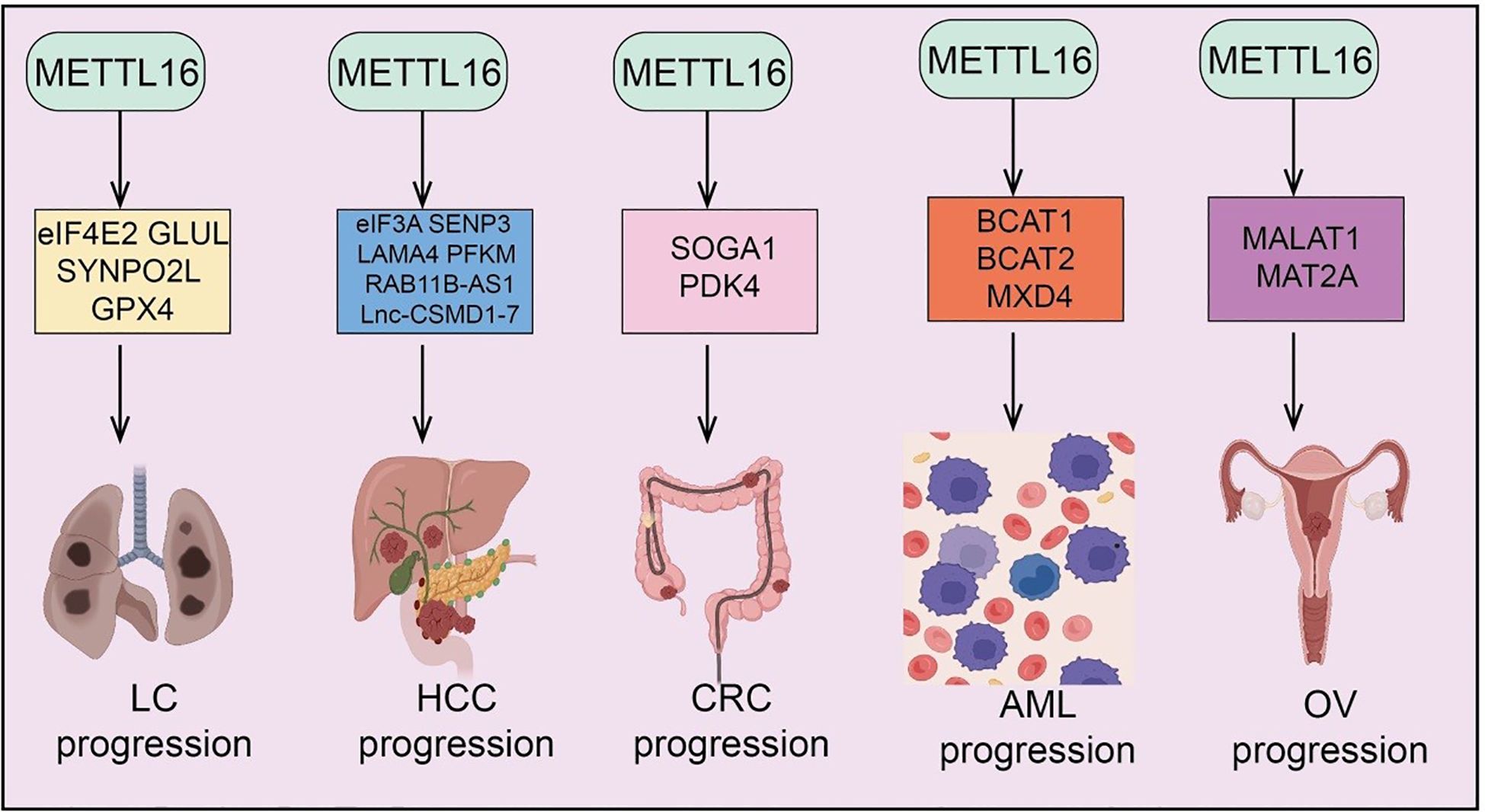 Figure 2. Target genes of METTL16 in LC, HCC, CRC, AML, and OV. METTL16 regulates the expression of various downstream target genes in an m6A modification–dependent manner, playing important roles and exerting key mechanisms in the progression of LC, HCC, CR), AML, and OV.
