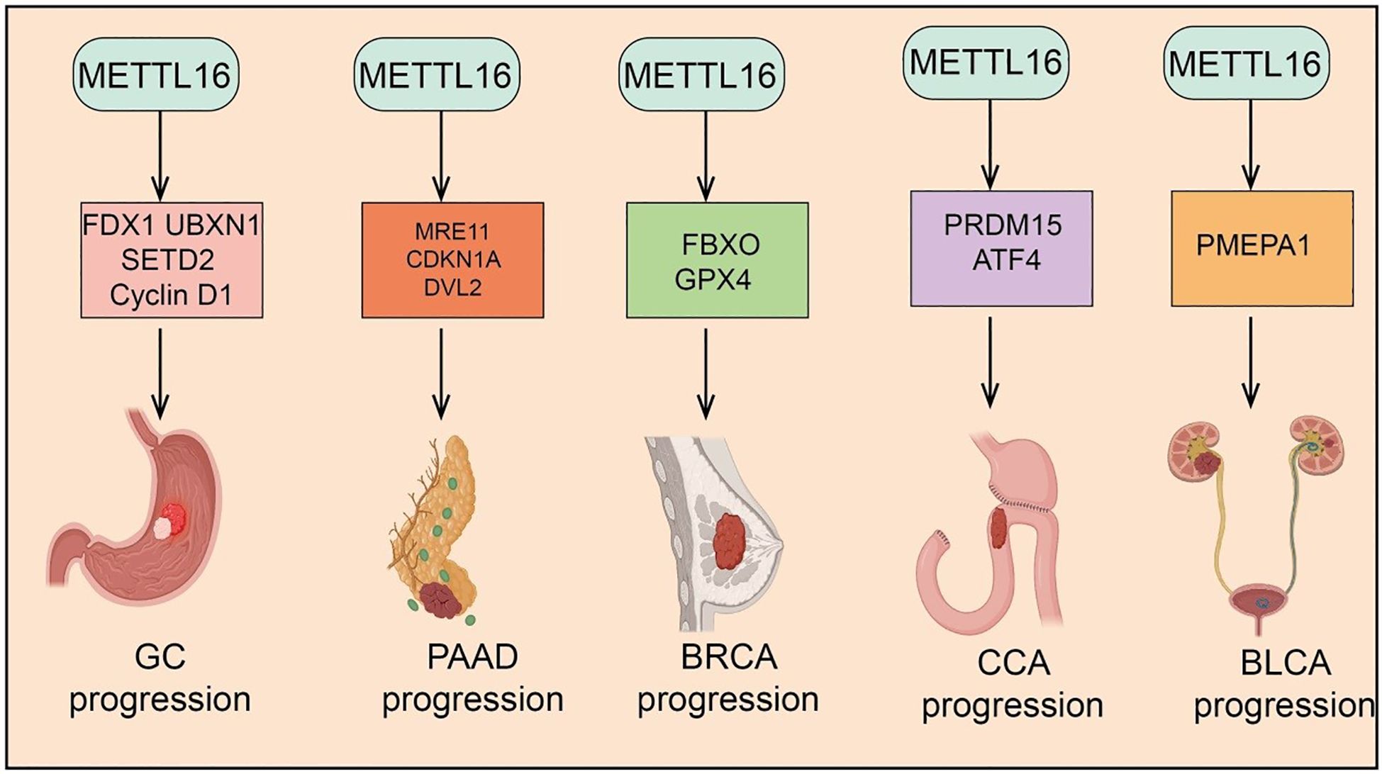 Figure 3. Target genes of METTL16 in GC, PAAD, CRC, CCA, and BLCA. METTL16 regulates the expression of various downstream target genes in an m6A modification–dependent manner, playing important roles and exerting key mechanisms in the progression of GC, PAAD, CRC, CCA, and BLCA. .