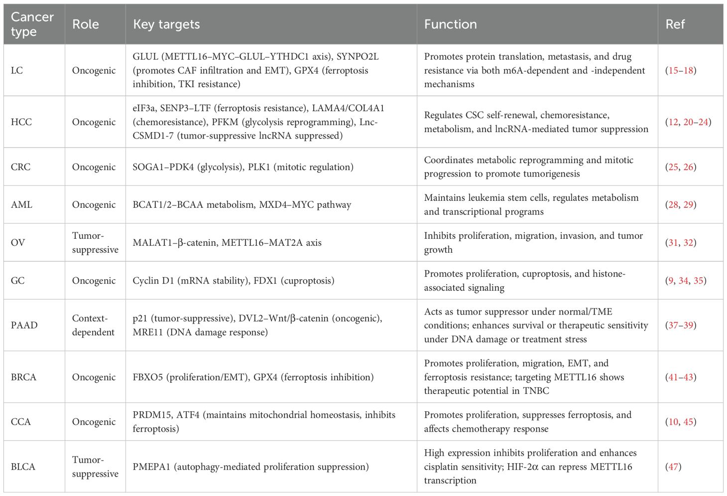 Moreover, METTL16 displays distinct target genes and regulatory mechanisms across cancer types. In HCC, METTL16 may influence ferroptosis and chemotherapy resistance via GPX4 or LAMA4/IGF2BP2 pathways. In AML, METTL16 predominantly regulates BCAT1/2 and MXD4 through m6A modifications (42), affecting branched-chain amino acid metabolism and MYC activity. In PAAD, METTL16 modulates DVL2 translation to regulate Wnt/β-catenin signaling, whereas in cholangiocarcinoma, it stabilizes ATF4 mRNA to suppress ferroptosis. These differences may reflect: (i) cancer-specific availability of RNA or protein substrates; (ii) tissue- or tumor-specific expression of m6A “readers” and “erasers”; and (iii) variations in TME and metabolic status, which influence METTL16 substrate selection and functional output.