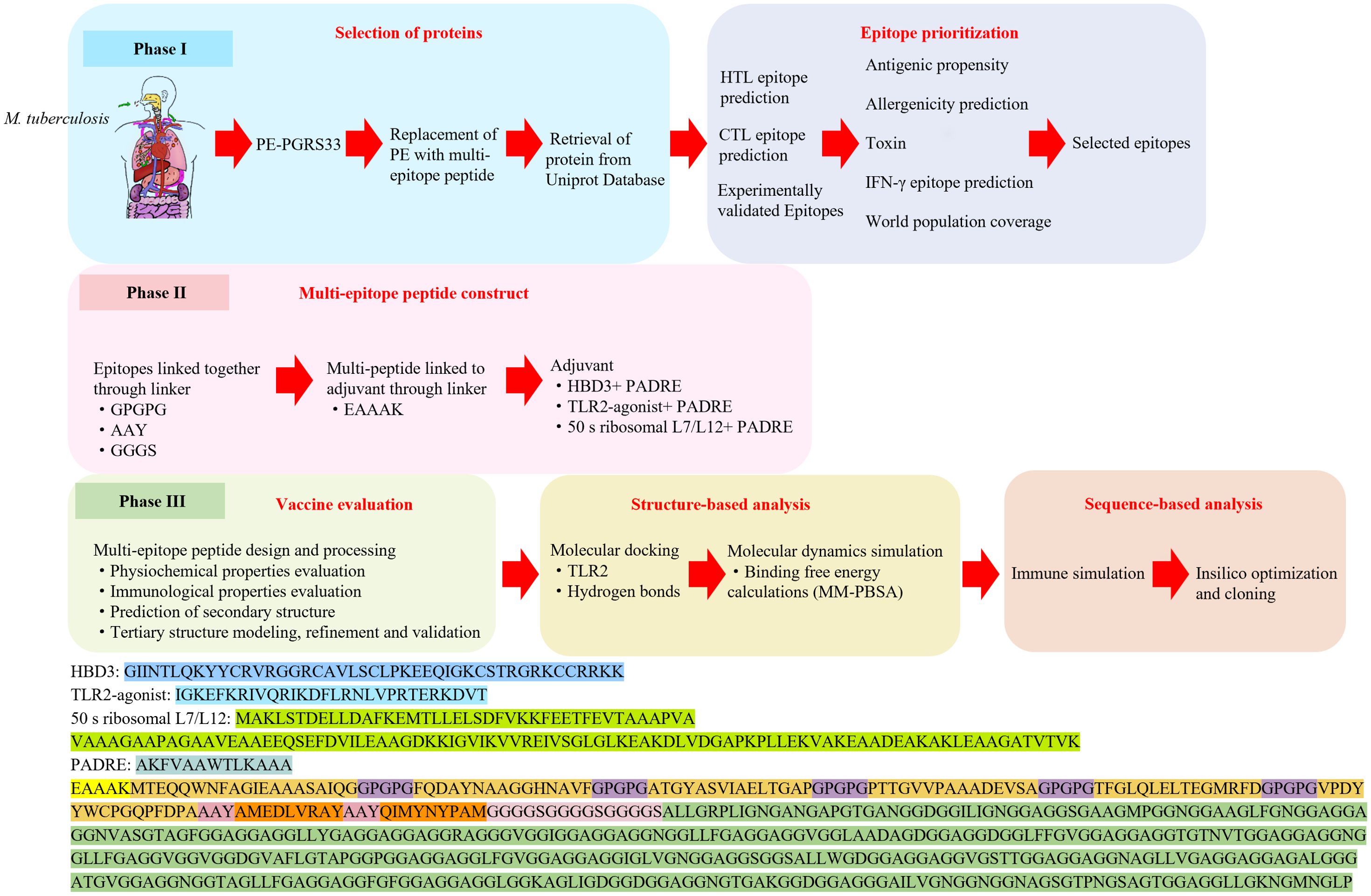 Flowchart depicting the multi-phase process of designing a vaccine against M. tuberculosis. Phase I involves protein selection, including PE-PGRS33 replacement and epitope prioritization. Phase II focuses on constructing multi-epitope peptides with specific linkers and adjuvants. Phase III includes vaccine evaluation, covering design, processing, and structural and sequence-based analyses like molecular docking, dynamics simulation, immune simulation, optimization, and cloning. Detailed sequences and linker processes are included.