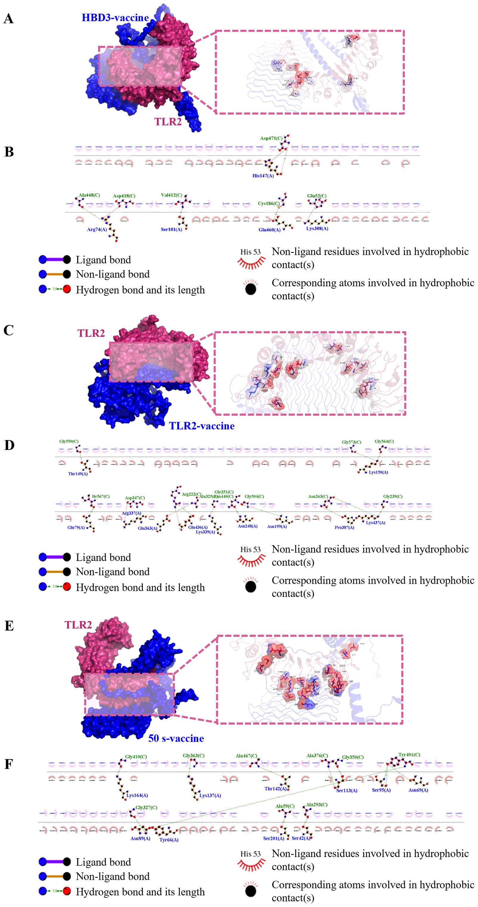 Figure 3. Visualization of molecular docking between vaccine candidate and TLR2. (A, B) HBD3-vaccine, (C, D) TLR2-vaccine, (E, F) 50 s-vaccine. (A, C, E) Results of molecular docking analysis for vaccine candidate with TLR2 predicted by GRAMM Server are shown. The left panel depicts a cartoon diagram of the molecular docking results, while the right panel displays a 3D zoomed-in diagram of the interactions between bonds at the molecular docking site. (B, D, F) 2D ligand-protein interaction diagram of the vaccine-TLR2 complex created using the LigPlot+ software.