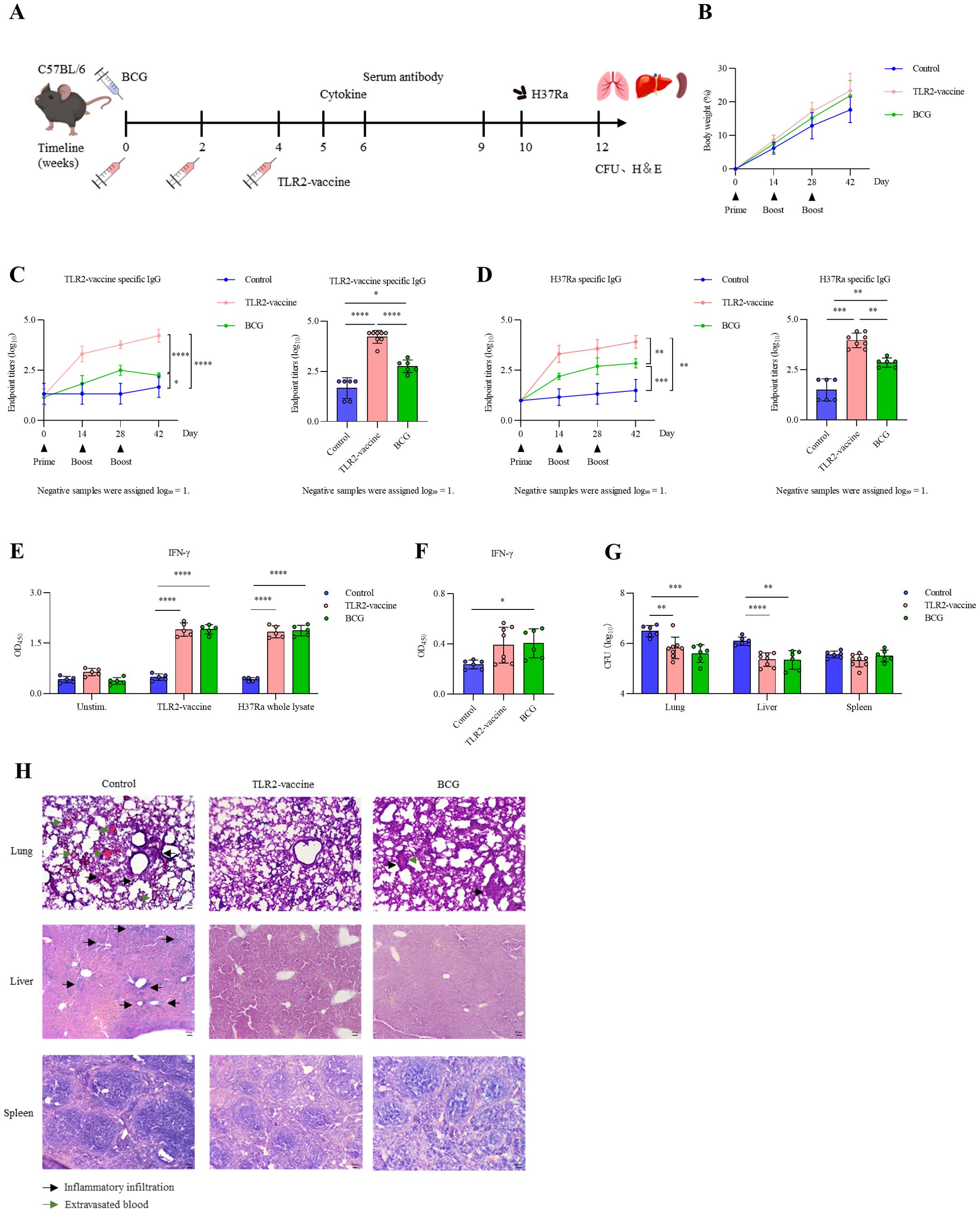TLR2-vaccine (10 μg/mouse) was dissolved in 100 μl PBS, emulsified with 100 μl incomplete Freund’s adjuvant (IFA), and administered subcutaneously three times at 2-week intervals. For BCG immunization, mice received 1 × 106 CFU M. bovis BCG in 100 μl PBS via subcutaneous injection on the back.