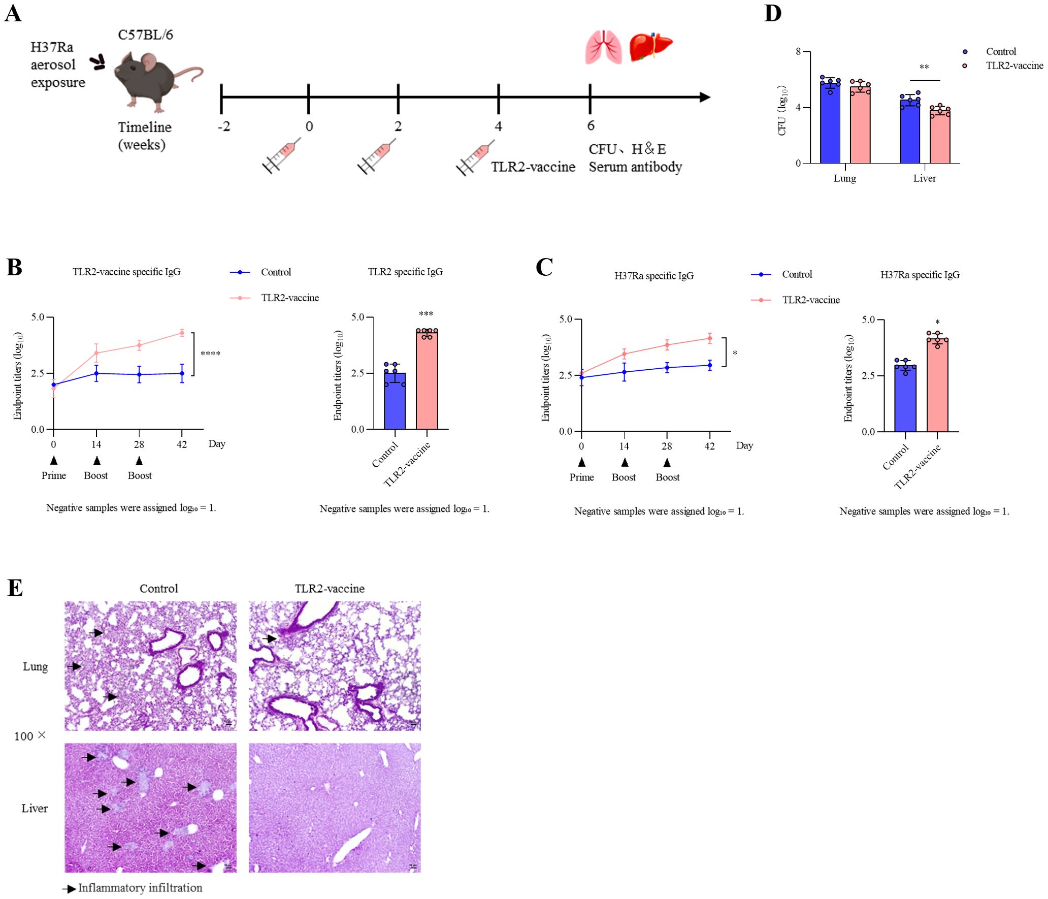 For the preventive infection model, mice were challenged with 2 × 106 CFU M. tuberculosis H37Ra in 100 μl PBS via tail vein. Two weeks later, lungs, livers, and spleens were harvested for bacterial load determination, and selected tissues were processed for hematoxylin and eosin (H&E) staining. Tissue homogenates were serially diluted 10-fold in PBS, and 100 μl of each dilution was plated on Middlebrook 7H10 agar (Solarbio, China). Plates were incubated at 37°C for 4 weeks before enumeration of colony-forming units (CFU). For the post-exposure protection model, mice were infected with aerosolized H37Ra using a Glas-Col inhalation exposure system (Terre Haute, IN, USA), adjusted to deliver an initial dose of ~200 CFU per mouse. Two weeks after infection, mice were immunized with TLR2-vaccine as described above, and bacterial loads and histopathology of the lungs and livers were assessed 2 weeks after the final immunization.