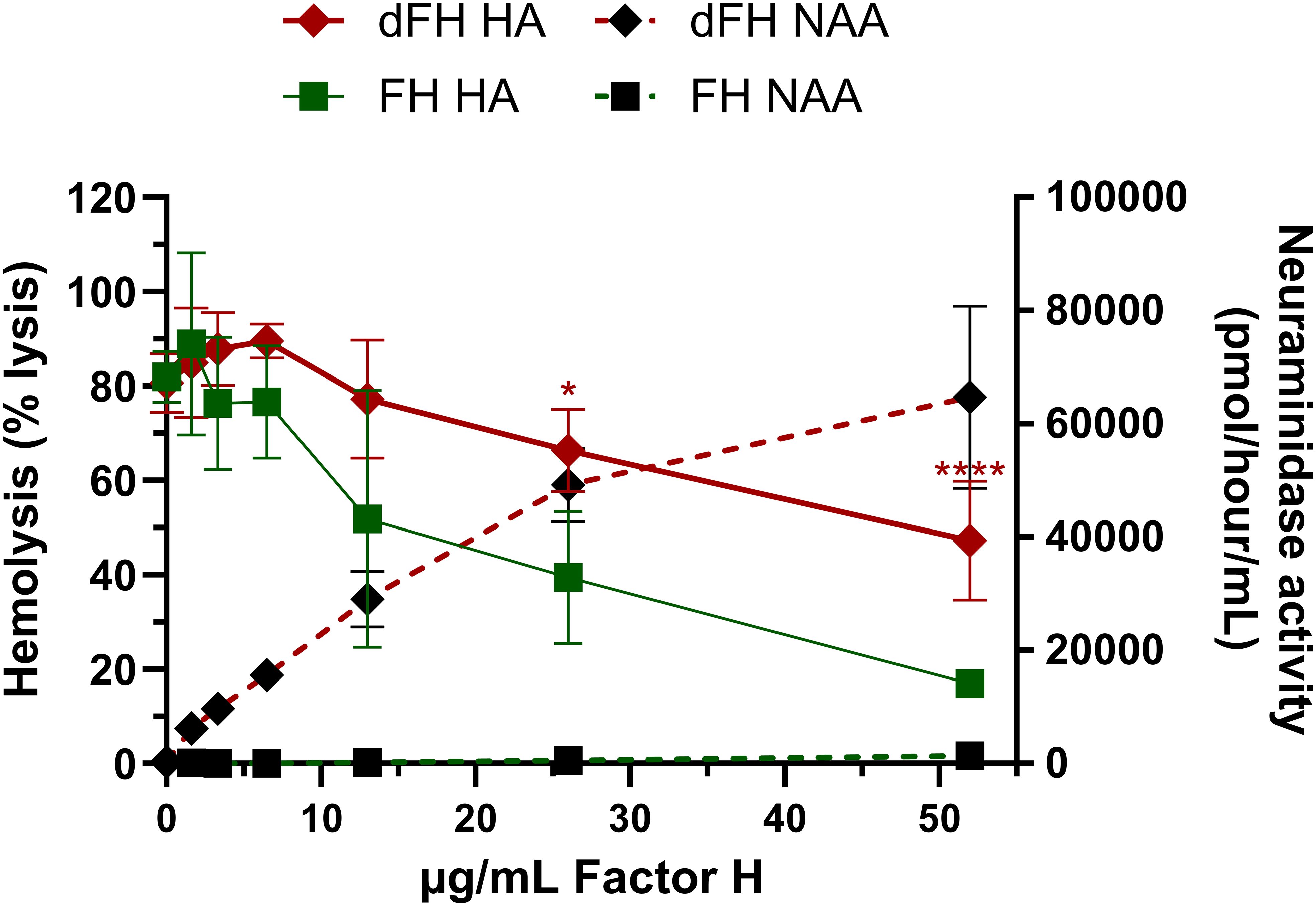 Figure 1. Evaluation of in vitro desialylated FH created according to the Gómez Delgado protocol. In vitro desialylated FH (dFH) was prepared using the Gómez Delgado protocol (1). In short, commercially available FH (CompTech) was treated with neuraminidase from C. welchii for 4 hours at 37°C. Following incubation, the reaction was halted by adjusting the pH to 10. In parallel, FH not treated with neuraminidase (FH) was included as a control. FH functionality was assessed using a sheep erythrocyte hemolytic assay (HA) as described previously (2) to evaluate FH’s capability to protect sheep erythrocytes from complement-mediated lysis. FH and dFH were added in increasing concentrations (0-52 µg/mL). The hemolysis is expressed as % the of the full lysis of erythrocytes in water. Compared to FH (green squares), dFH shows increased hemolysis (red diamonds) suggesting impaired FH complement-regulatory function. Following the HA, the neuraminidase activity assay (NAA) was performed in the supernatants of the HA by fluorometry as described previously (2). dFH shows increased neuraminidase activity in a dose-dependent manner (black diamonds). No neuraminidase activity was detected in the FH sample (black squares). HA data represents the mean ± SD of three independent preparations of dFH/FH measured in two separate experiments. Statistical significance comparing dFH and FH was determined for the HA using multiple unpaired T tests followed by Holm-Sidák’s multiple comparison test; * p ≤ 0.05; and **** p ≤ 0.0001. NAA results are shown as the mean ± SD of three independent experiments. The figure was adapted from previously published data (2), Figures 6A, B.