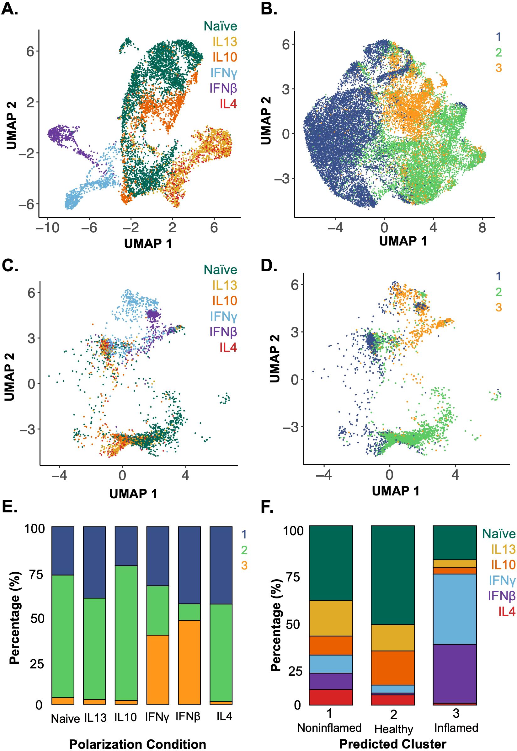 Figure 4. Applying a model trained on in-vitro-polarized macrophage datasets identifies the polarization states of in vivo terminal ileal macrophages in clinical scRNA-seq data. (A) UMAP of in-vitro-polarized macrophage scRNA-seq data using the shared set of 325 genes labeled by polarization condition (colors as in Figure 2). (B) UMAP of in vivo terminal ileal macrophages labeled by unsupervised clusters from Figure 3D after reducing the 28, 923 gene dataset to the 325 genes shared with the in vitro atlas. (C) In-vitro-polarized macrophages integrated with the terminal ileal dataset using SCTransform anchors and mapped onto a shared UMAP, labeled by polarization condition. (D) Assignment of in-vitro-polarized macrophages to in vivo clusters 1–3 using a weighted mutual nearest neighbor approach. (E) Proportion of cells from each polarization condition assigned to each in vivo macrophage cluster by mutual nearest-neighbor classification. (F) Assignment of polarization states to macrophages found in vivo which were grouped by unsupervised clustering (Figure 3D) and are predominantly associated with noninflamed (cluster 1), healthy (cluster 2) and inflamed (cluster 3) tissues (Figure 3E).