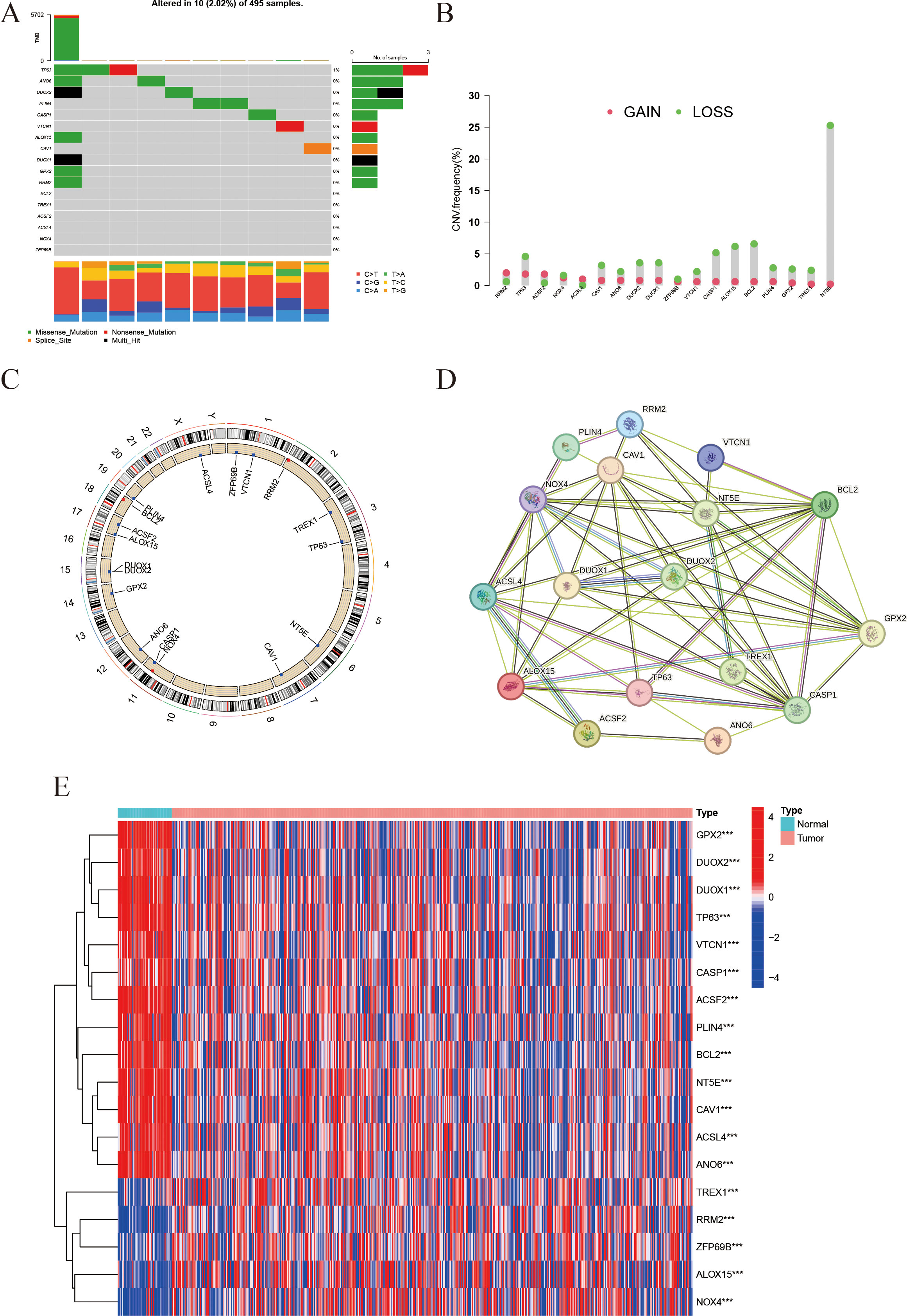 Figure 2. Landscape of IFRGs: mutation spectrum, copy-number variations, and expression profiles. (A) The waterfall plot presents the mutation types and frequencies of genes across samples. (B) The bar chart represents copy number variations (CNVs), with red dots indicating copy-number gains and green dots indicating losses. (C) The Circos plot shows the chromosomal distribution of the studied genes. (D) The protein-protein interaction (PPI) network illustrates interactions among the genes, with line color indicating interaction type and line thickness indicating interaction strength. (E) The heatmap displays gene expression levels in tumor vs. normal tissues, with color intensity representing expression level (*** indicates p < 0.001).