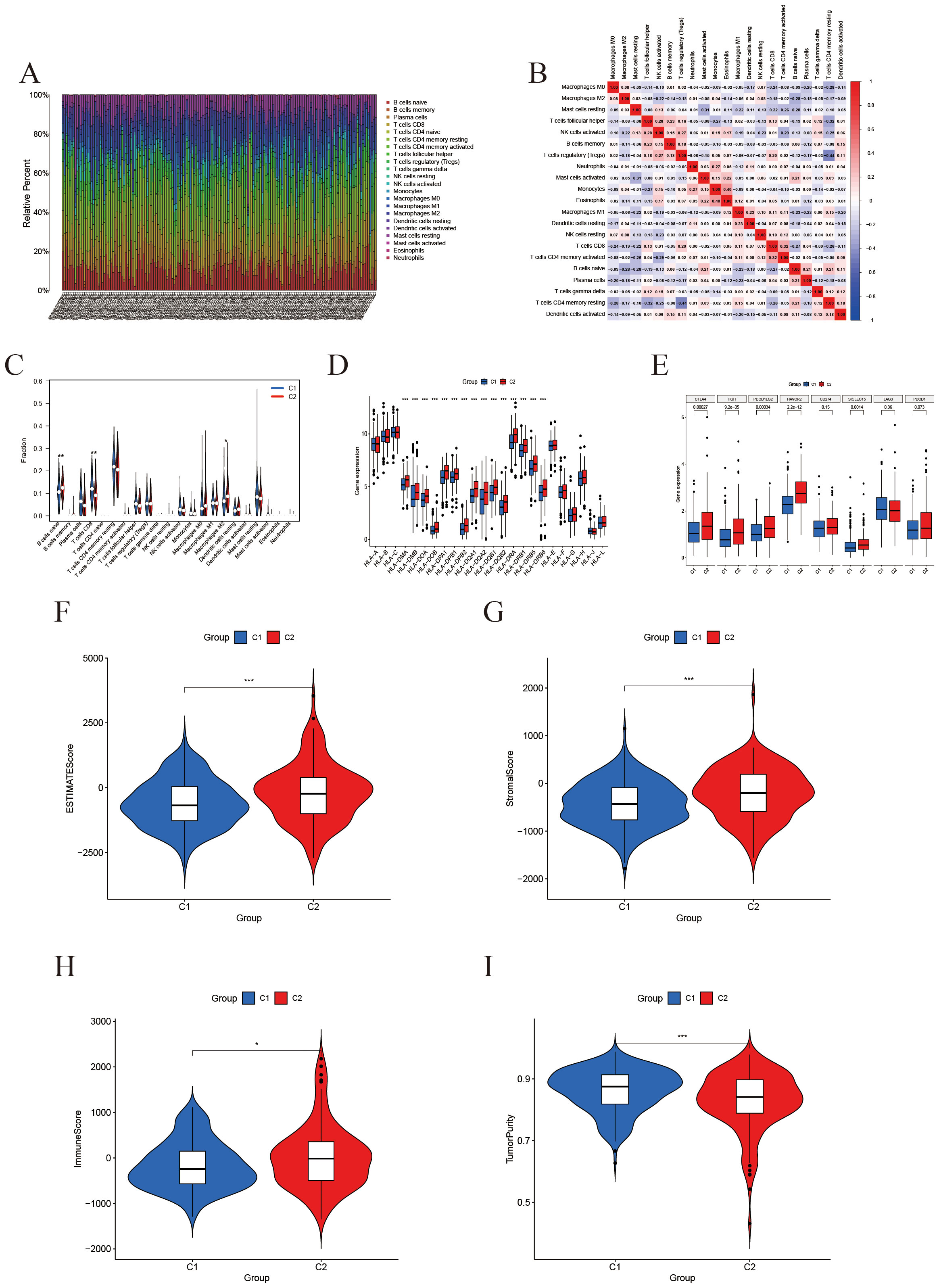 Figure 4. Immune microenvironment characterization based on IFRG subtypes. (A) Immune cell composition: A stacked bar plot of the relative fractions of 22 immune cell types in each sample, as estimated by the CIBERSORT algorithm. (B) Immune cell correlation heatmap: Spearman correlation coefficients among the infiltration levels of the 22 immune cell types; color intensity denotes the strength of correlation. (C) Violin plots comparing immune cell infiltration between the C2 group (red) and C1 group (blue). *, **, and *** indicate p < 0.05, 0.01, and 0.001, respectively. (D) Boxplot of Differential Expression of HLA Genes. (E) Boxplot of Differential Expression of Immune Checkpoints. (F-I) ESTIMATE score comparisons (violin plots): Comparison of the ESTIMATE composite score, StromalScore, ImmuneScore, and tumor purity between the two groups. The high-expression group shows significantly higher ESTIMATE and stromal scores, a modest increase in ImmuneScore, and a marked reduction in tumor purity.