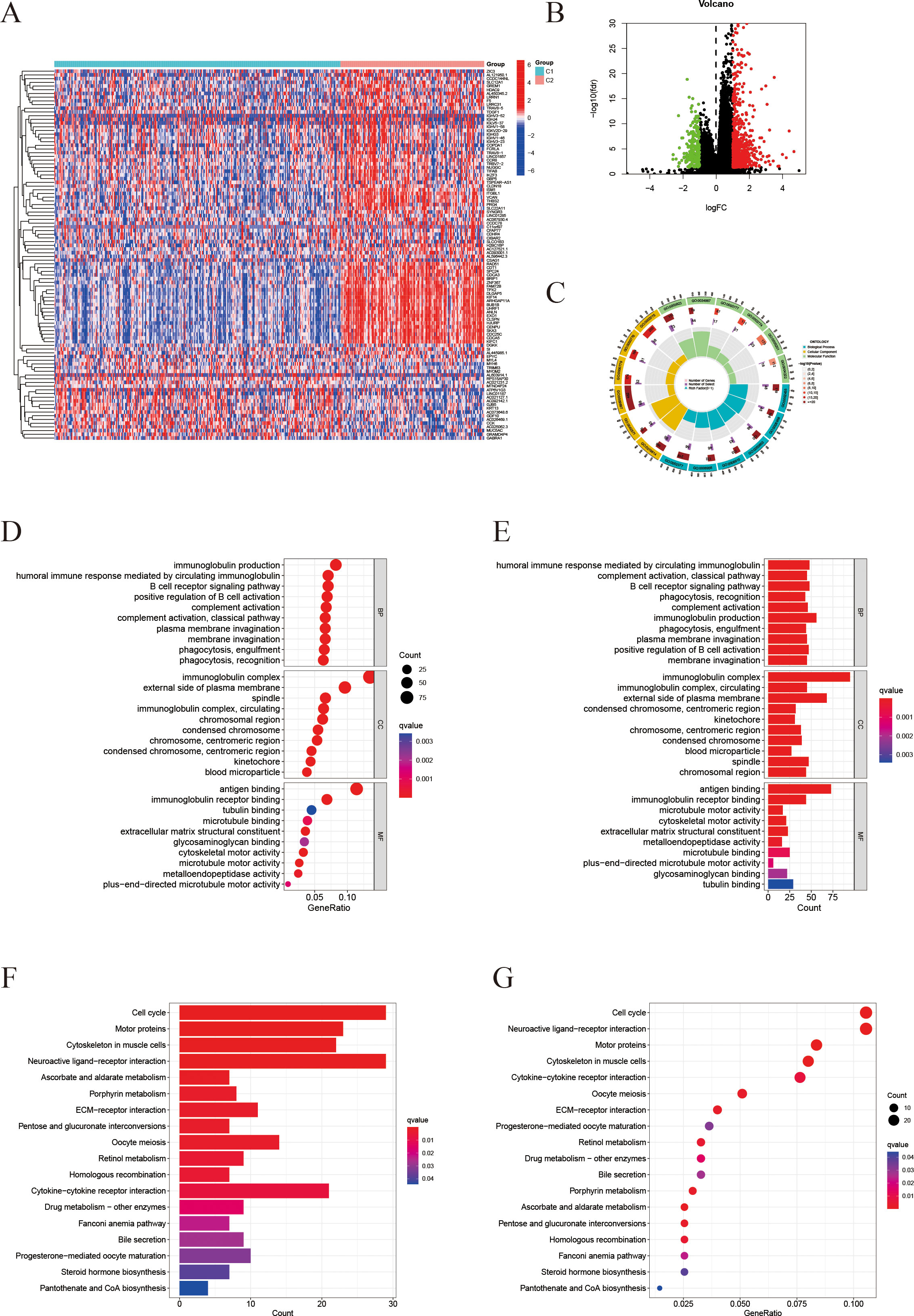 Figure 5. Differential gene expression profiling and enrichment analyses. (A) Heatmap of differentially expressed genes (DEGs) comparing the C2 and C1 groups. (B) Volcano plot visualizing the DEGs (threshold: |log2FC| > 1, P < 0.05). (C) Circos plot illustrating the genomic locations of the DEGs. (D, E) Gene Ontology (GO) enrichment analysis results for Biological Process (BP), Cellular Component (CC), and Molecular Function (MF) in the C2 group (D) and C1 group (E). Redder color indicates a smaller q-value (higher enrichment significance). (F, G) KEGG pathway analysis: (F) shows the distribution of genes in significantly enriched pathways; (G) shows a bubble chart of enriched pathways, where dot size represents gene count and color indicates the q-value.