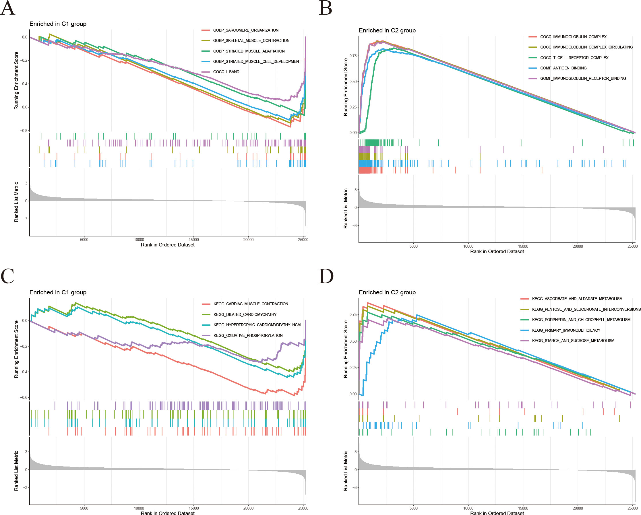 Figure 6. Differential gene GSEA analyses. (A, B) Gene Set Enrichment Analysis (GSEA): (A) Gene sets significantly enriched in C1 group; (B) Gene sets significantly enriched in C2 group. (C, D) KEGG-GSEA: (C) KEGG pathways enriched in C1 group; (D) KEGG pathways enriched in C2 group.