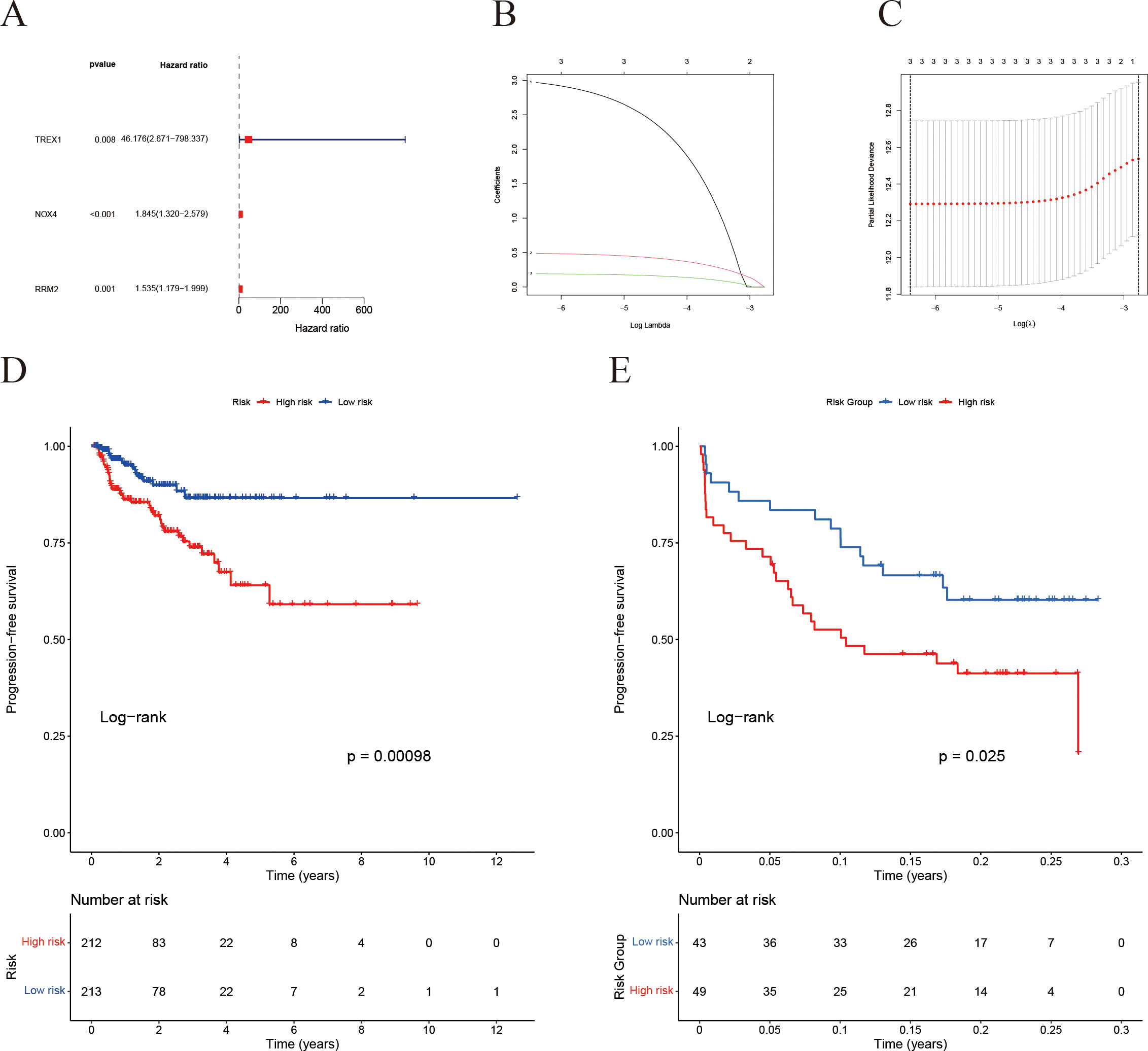 Utilizing the TCGA training dataset, we conducted univariate Cox proportional hazards regression analyses on each of the 18 IFRGs to identify genes that exhibited a significant association with PFS (P < 0.05). This analysis led to the selection of three genes: TREX1, NOX4, and RRM2. Subsequently, we employed LASSO-Cox regression with the glmnet package, which automatically standardizes the input data prior to model fitting, to construct a multivariate prognostic model. The optimal lambda value was established through cross-validation, culminating in the formulation of a final model. The risk score for each patient was computed as a weighted sum of the gene expression levels, represented mathematically as: