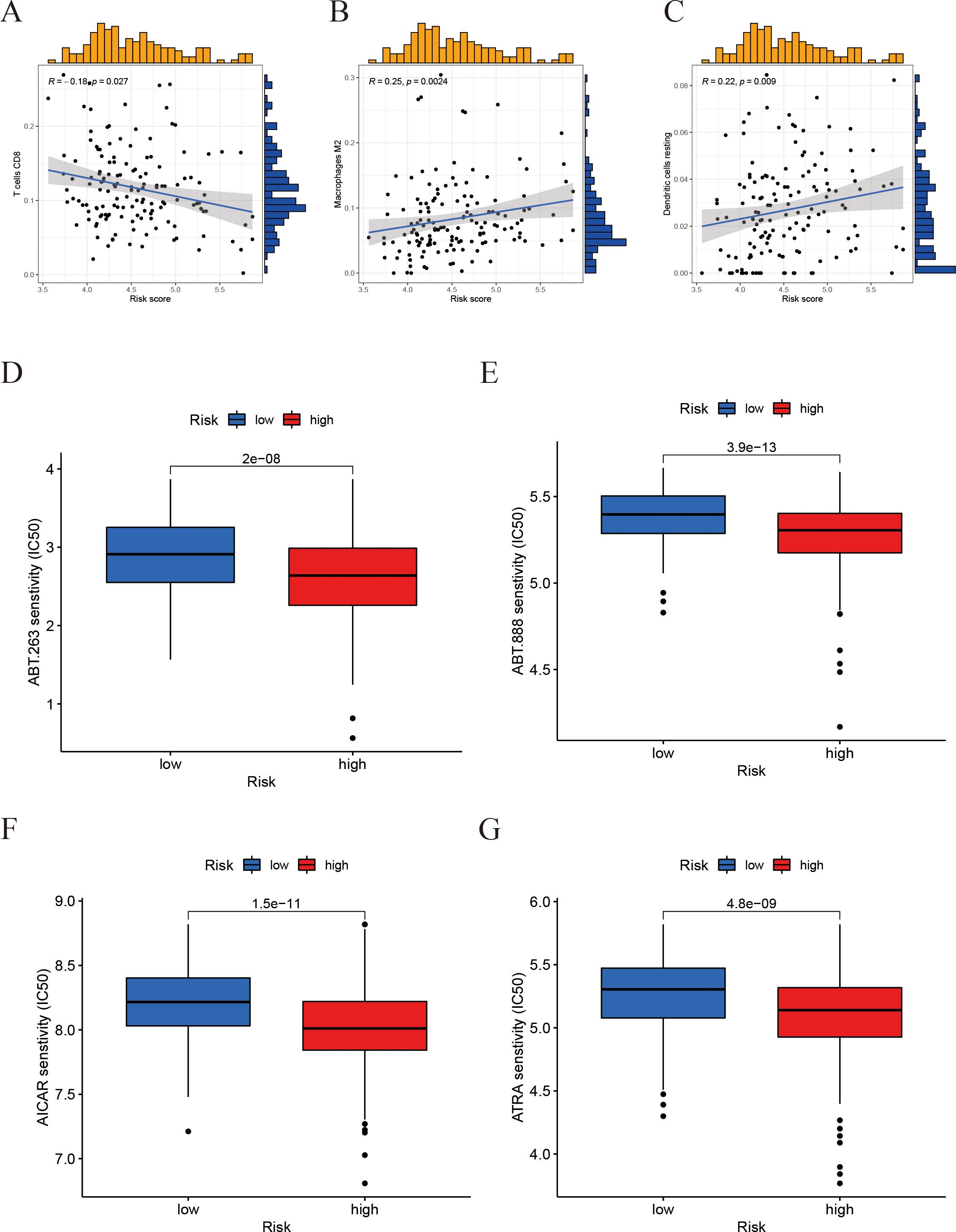 To further clarify the immunological implications associated with the prognostic model, we performed an analysis of immune cell correlations. The findings indicated a negative correlation between the risk score and the presence of CD8+ T cells (Figure 9A). Conversely, M2-type macrophages and resting dendritic cells exhibited a positive correlation with the risk score (Figures 9B, C). These results imply that individuals with elevated risk scores may experience some immune suppression or dysfunction, evidenced by fewer CD8+ T cells. Furthermore, the drug sensitivity analysis (Figures 9D–G) revealed that the high-risk group demonstrated significantly reduced half-maximal inhibitory concentrations (IC50) for ABT-263, ABT-888, AICAR, and ATRA.