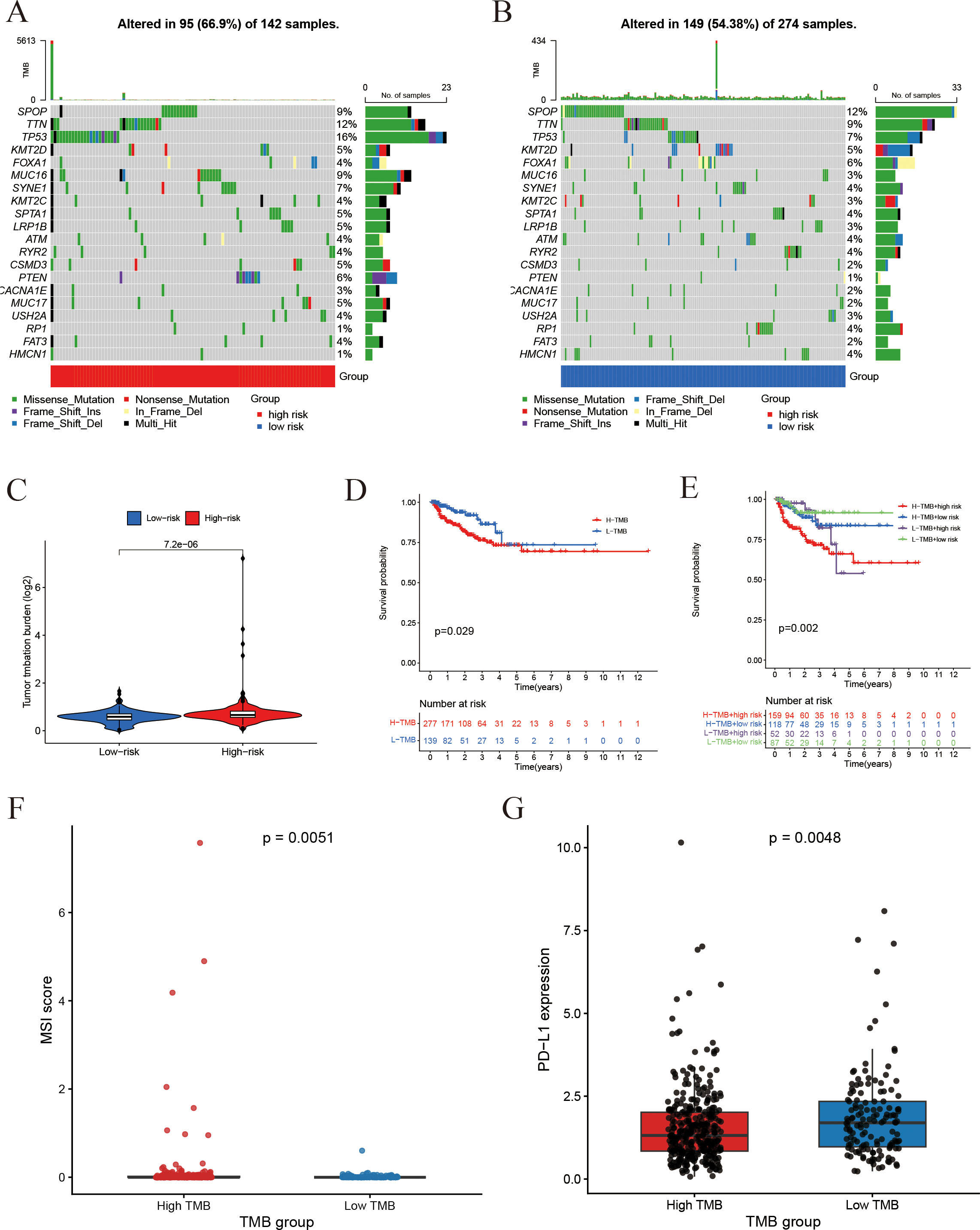 Figure 10. Association of risk score with somatic mutations and tumor mutation burden. (A, B) Somatic mutation profiles: (A) Gene mutation profile of high-risk group; (B) Gene mutation profile of the low-risk group. (C) Tumor mutation burden (TMB) comparison between groups. (D) Impact of TMB on Progression-free survival. (E) Combined effect of TMB status and risk score on Progression-free survival. (F) Comparison of MSI scores between the high-TMB and low-TMB groups. (G) Comparison of PD-L1 expression between the high-TMB and low-TMB groups.