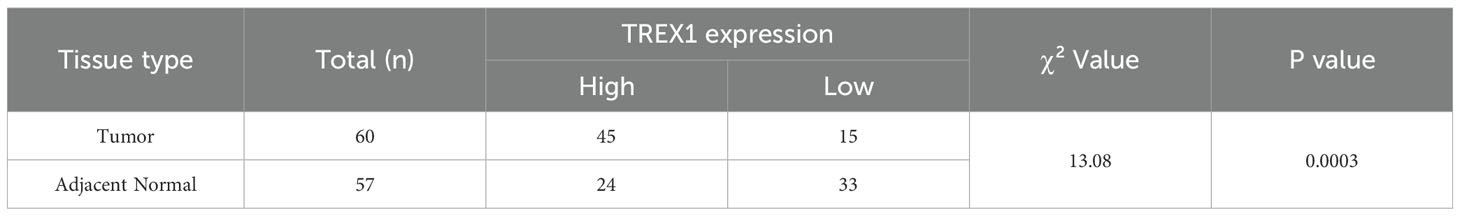 The TMA underwent dewaxing and rehydration following standard protocols, which included baking at 63°C for one hour and sequential incubation in xylene, followed by 100%, 90%, 80%, and 70% ethanol. Antigen retrieval was achieved using citrate buffer (pH 6.0) via microwave or water bath methods. Endogenous peroxidase activity was inhibited with 3% H2O2 in methanol for a duration of 10 minutes. Subsequently, the slides were blocked with 5% BSA in PBS for 30 minutes at room temperature. The primary antibody targeting TREX1 (rabbit anti-TREX1 [EPR14985], ab185228, Abcam) was applied at a dilution of 1:200 and incubated overnight at 4°C. The following day, sections were washed with PBS and incubated with HRP-conjugated goat anti-rabbit secondary antibody for one hour at room temperature. After washing, staining was visualized using DAB substrate, and the slides were counterstained with hematoxylin, dehydrated, and coverslipped using mounting medium. TREX1 immunoreactivity was evaluated by two independent pathologists, with cytoplasmic staining scored on a scale of 0 to 3 for intensity (0, negative; 1, weakly positive; 2, intermediately positive; and 3, strongly positive) and 0 to 3 for the percentage of positive cells (0, no staining; 1: <25% cells; 2: 25%–75% cells; and 3: >75% cells), resulting in a combined score ranging from 0 to 9. Samples were classified as exhibiting low expression (0–3) or high expression (4–9). Statistical analysis was performed to compare TREX1 expression levels between cancerous and adjacent tissues using the Chi-square test.