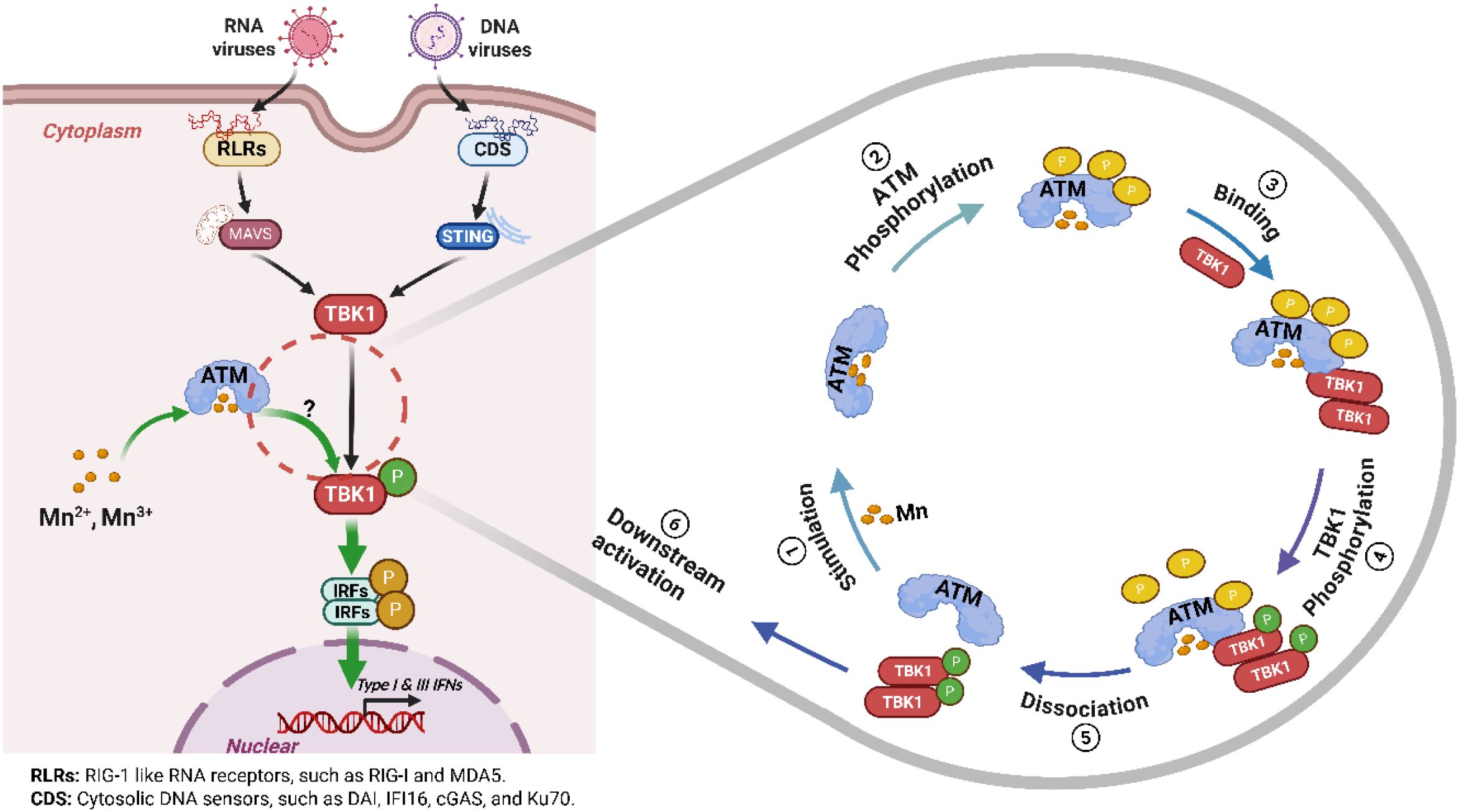 In this study, we delineated an Mn-enhanced antiviral innate immune response mediated by an ATM–TBK1 phosphorylation axis, wherein ATM activation positively correlated with TBK1 phosphorylation. ATM exhibits an Mn-dependent function, a previously unrecognized role in innate immune responses that are commonly present in multiple cell types. The ATM–TBK1 dynamic cycle is essential for the Mn-mediated innate immune response. However, Zhang et al. reported an alternative ATM–TBK1 model, where ATM inhibition triggers TBK1 activation and type I IFN production in pancreatic cells, a response that is further amplified by radiation (95). In their study, radiation-induced DNA damage leads to the release of damaged DNA into the cytoplasm, which activates the cGAS–STING pathway, culminating in TBK1 activation and IFN production. In this pathway, ATM does not directly phosphorylate TBK1; rather, ATM inhibition reduces phosphorylation of CHK2 and AKT2 while increasing phosphorylation of p70-S6K and SRC, with phosphorylated SRC subsequently phosphorylating TBK1 (95). Therefore, we speculated that the interplay between ATM and TBK1 is stimulus- and cell-type dependent, and the signaling pathway may differ under distinct biological contexts. Additionally, our study demonstrates that Mn directly induces ATM phosphorylation at Ser1891/1981/2996, whereas DNA damage primarily relies on Ser1981 autophosphorylation. This suggests that site-specific phosphorylation of ATM may determine its distinct downstream functions in the contexts of innate immunity and DNA repair.