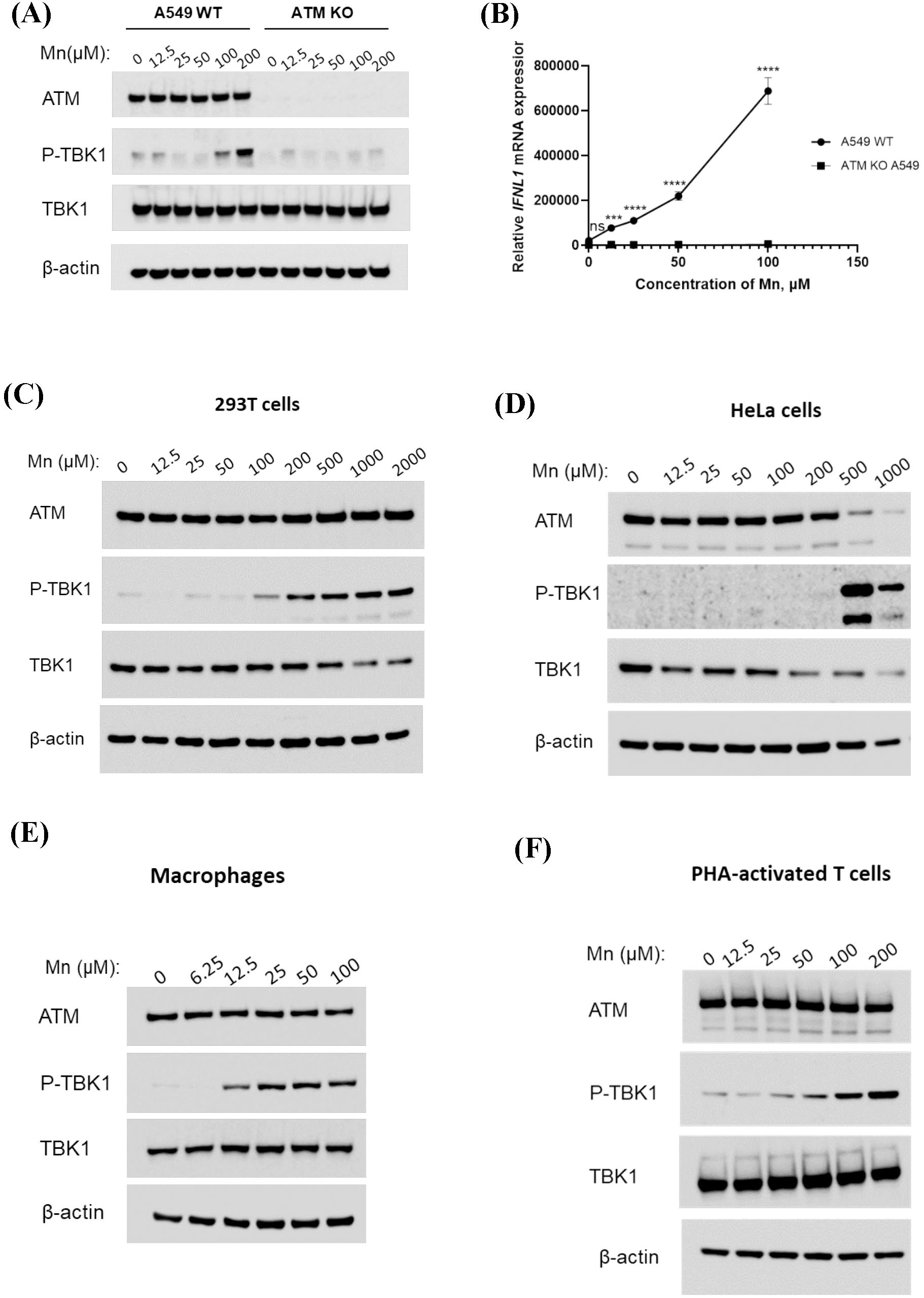 Figure 1. Mn dose-dependently phosphorylates TBK1 in multiple cell types in an ATM-dependent manner. (A) A549 wild-type and ATM KO A549 cells were treated with increasing concentrations of MnCL2. Total cell lysates were prepared 24 hours post-treatment using RIPA buffer and analyzed by Western blot using antibodies against ATM, TBK1, and p-TBK1. β-actin served as a loading control. Images are representatives of three independent experiments. (B) A549 and ATM KO A549 cells were treated with the indicated concentrations of MnCL2, followed by stimulation with linearized DNA 24 hours later. After an additional 24 hours, total RNA was extracted, and IFN-λ1 mRNA expression levels were measured by quantitative RT-PCR and normalized to GAPDH. Data represents at least three independent experiments and are shown as mean ± SD (n=3). Statistical significance was determined using Two-way ANOVA with Dunnett’s multiple comparisons test, p > 0.05 (ns), p < 0.001 (***), and p < 0.0001 (****). (C–F) 293T cells (C), HeLa cells (D), MDMs (E), and PHA-activated CD4+ T cells (F) were treated with varying doses of MnCL2. Whole cell lysates were collected after 24 hours and analyzed by Western blot using anti-ATM, anti-p-TBK1, and anti-TBK1 antibodies. β-actin was included as an internal loading control. All images are representatives of three independent experiments.