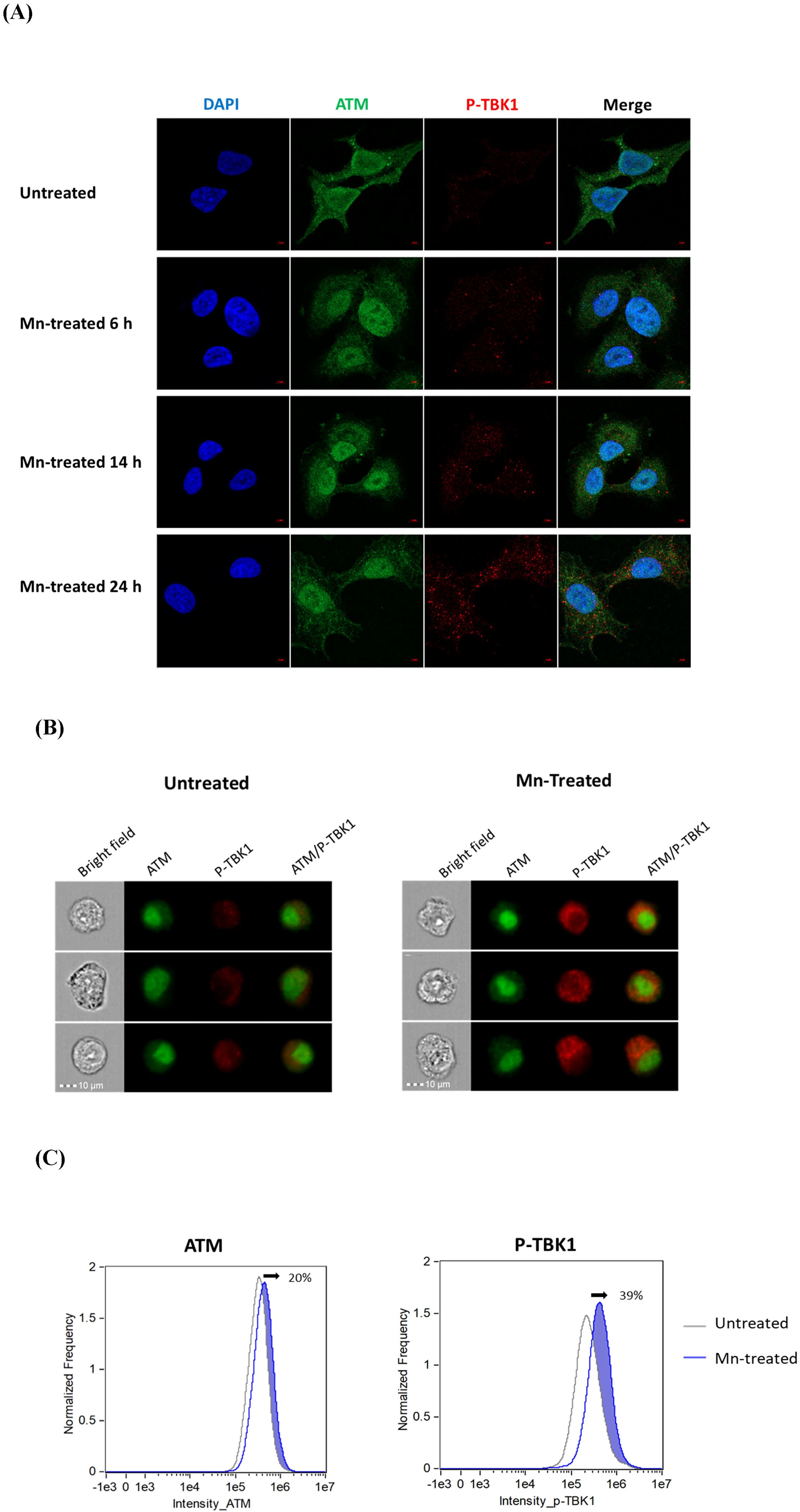 Figure 2. Cytoplasmic ATM promotes phosphorylation of TBK1. (A) Confocal microscopy analysis of the localization and expression of ATM and p-TBK1 in A549 cells after Mn treatment. A549 cells were grown on 12mm coverslip-inserted 12-well cell culture plates and treated with or without 100 µM MnCL2, then fixed, permeabilized and stained with anti-ATM (green), anti-P-TBK1 (Red) antibody at 6, 14 and 24 h after Mn treatment. Nuclei were counterstained with DAPI (blue), and cells were imaged using a 63×/1.4 objective. Images are representative of at least three independent experiments. (B, C) AMINS analysis for the expression of ATM and p-TBK1. A549 cells were seeded on 6-well cell culture plates and treated with or without Mn treatment at 100 µM, then detached using Accutase at 24 h after Mn treatment, fixed, permeabilized, and stained by anti-ATM (Green) and anti-p-TBK1 (Red) antibodies, the single cell morphonology was viewed by bright field. (B) Image galleries display of brightfield, fluorescence dyes AF647 (ATM, channel 11) and AF488 (p-TBK1, channel 2), and composite image of the two fluorescence channels. Images are representative of at least three independent experiments. (C) Histogram overlay of ATM and p-TBK1 intensity of untreated versus Mn-treated focused single cells. The shifted area was shaded in blue, and the shifted percentage (calculated by Fiji) were indicated in the figure.