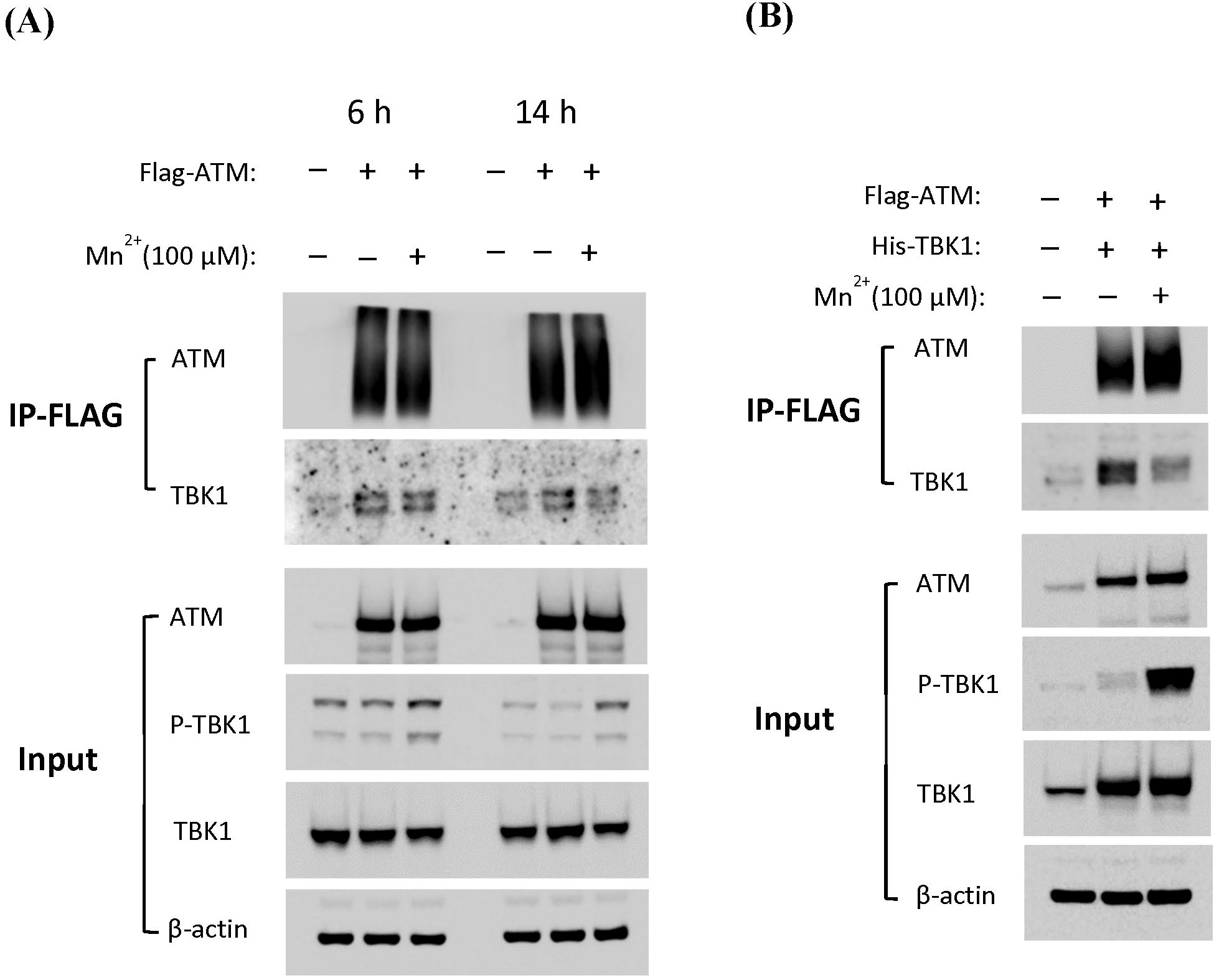 Figure 3. TBK1 first interacts with ATM and later dissociates from the ATM–TBK1 complex after it becomes phosphorylated. ATM KO 293T cells were transfected with (A) Flag-tagged ATM or (B) a combination of plasmids encoding Flag-tagged ATM and His-tagged TBK1 and then were treated by MnCL2 at 100 µM. Cytosolic lysates were prepared at 6 or 14 h after Mn treatment, followed by immunoprecipitation (IP) with anti-Flag antibody-conjugated agarose. Precipitated proteins were then analyzed by Western blotting with antibodies against ATM and TBK1. Input controls were also included. All WB images are representative of three independent co-IP experiments.