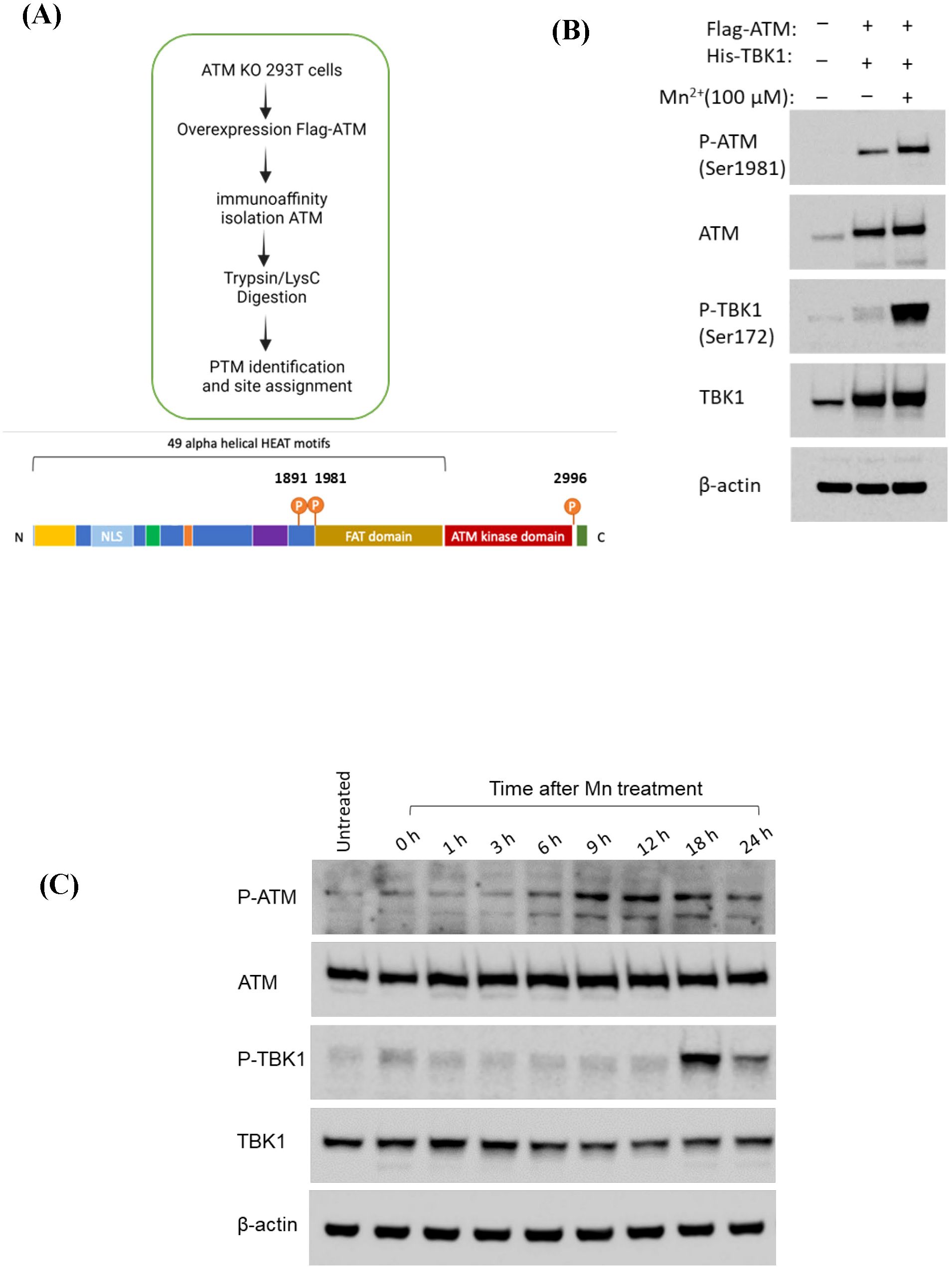 Figure 4. Mn phosphorylates ATM at multiple sites at an earlier time point. (A) The illustration for Mass spectrometry process and identified phosphorylated sites on ATM by Mn treatment, n=1. (B) ATM KO 293T cells were overexpressed by Flag-tagged ATM and His-tagged TBK1 and then treated by Mn at 100 µM. The whole cell lysate was prepared and analyzed by western blot using the antibodies against p-ATM (Ser1981), ATM, p-TBK1 (Ser172), anti-β-actin was included to indicate loading control. (C) A549 cells were seeded in 6-well cell culture plates and treated with Mn at 100 µM. The total cell lysate was prepared using RIPA buffer at different time points after Mn treatment. The cell lysate was analyzed by anti-p-ATM, anti-ATM, anti-p-TBK1 and TBK1 antibodies. Anti-β-actin was included as the internal loading control for the experiment. The WB images are representative of three independent experiments.