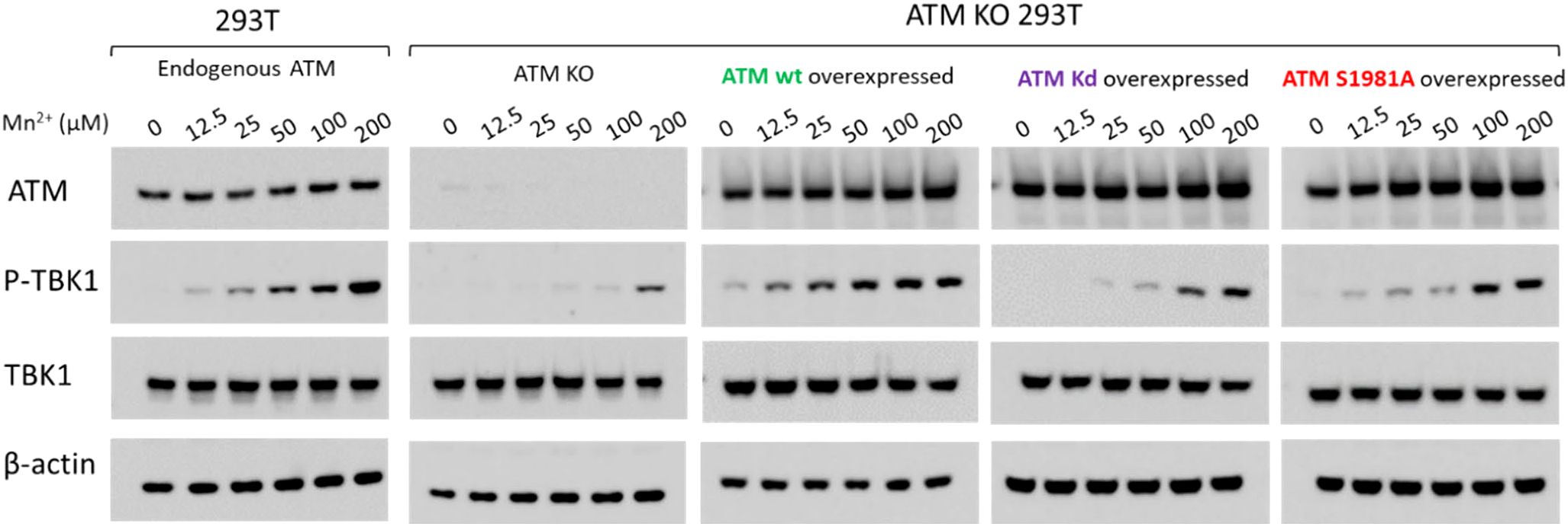 Figure 5. ATM mutants retain partial phosphorylation activity toward TBK1 ATM KO 293T cells were overexpressed by transfecting plasmids encoding wild type ATM (wt ATM), mutated ATM at kinase domain (ATM kd), mutated ATM at S1981A (ATM S1981A), respectively, and treated with Mn at varying concentrations. The total cell lysate was collected at 24 h after Mn treatment and subjected to western blot analysis using anti-ATM, p-TBK1, TBK1 antibodies, anti-β-actin was included as internal loading control. Untransfected 293T cells were also included in the experiment to serve as positive control. Images are representative of three independent experiments.