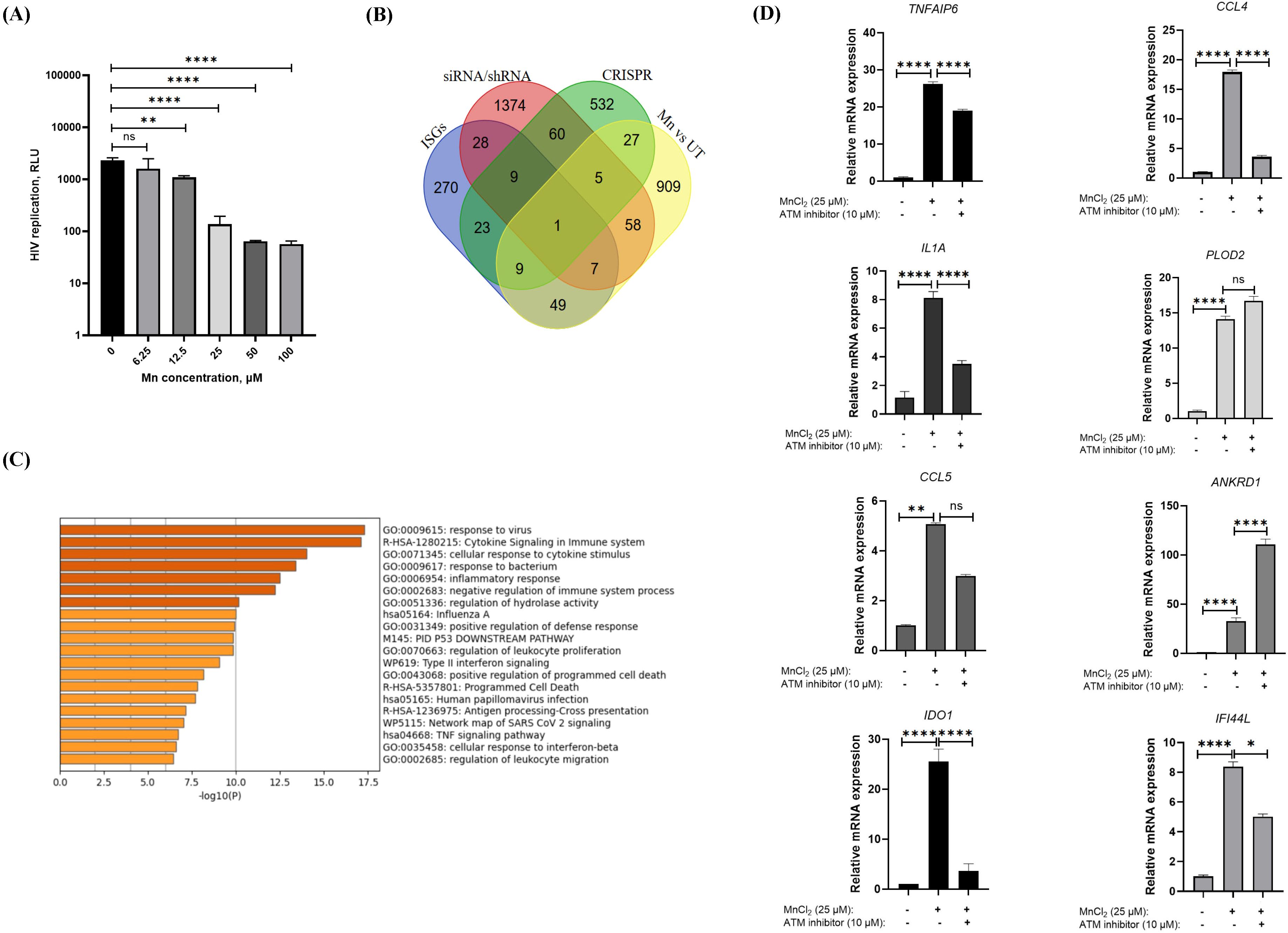 (A) Bar graph showing HIV replication in RLU at different manganese concentrations. Significant differences are indicated by asterisks. (B) Venn diagram displaying gene overlap among ISGs, siRNA/shRNA, CRISPR, and Mn vs. UT groups. (C) Horizontal bar chart illustrating gene ontology terms related to immune responses, with significance on the x-axis. (D) Multiple bar graphs showing relative mRNA expression of genes (TNFAIP6, CCL4, IL1A, PLOD2, CCL5, ANKRD1, IDO1, IFI44L) with and without MnCl2 and ATM inhibitor. Statistical significance is marked by asterisks.