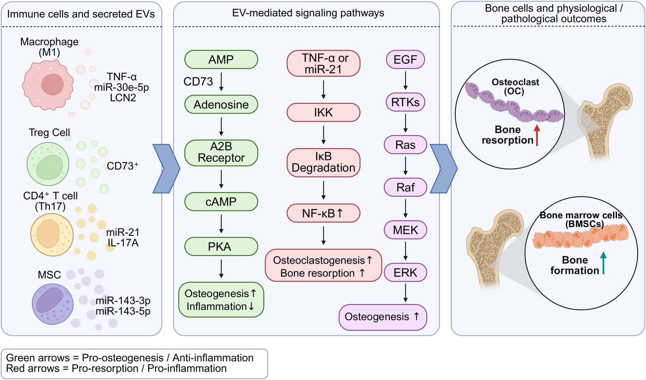 The pathological relevance of EV-mediated communication is evident in multiple diseases. In periodontitis, Porphyromonas gingivalis–derived EVs suppress acetylcholine secretion by inhibiting Cyp4f40, which accelerates osteoclastogenesis and bone loss (5). Similarly, immunocyte-derived EVs facilitate bone metastasis by establishing pre-metastatic niches through integrin-mediated homing and microenvironmental modulation (6). Collectively, these studies indicate that EVs are central regulators maintaining skeletal balance under physiological conditions, but when dysregulated, they contribute to osteoporosis, rheumatoid arthritis, and periodontitis (7–9).