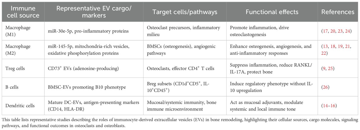 The bone microenvironment is increasingly recognized as an EV-rich niche, where vesicle-mediated immune–bone crosstalk contributes to both skeletal development and pathological bone loss. Here, we first summarize the biology and cargo features of immunocyte-derived EVs, then outline their bidirectional crosstalk with bone marrow stromal cells (BMSCs), examine disease-specific roles in periodontitis, osteoporosis, and rheumatoid arthritis, and finally discuss engineering and translational applications.