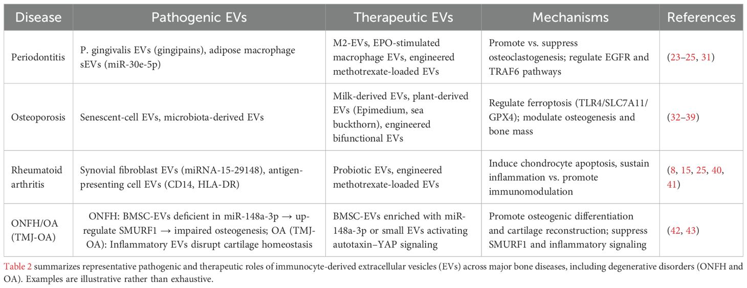Table 2. Representative pathogenic and therapeutic roles of immunocyte-derived EVs across major bone diseases.