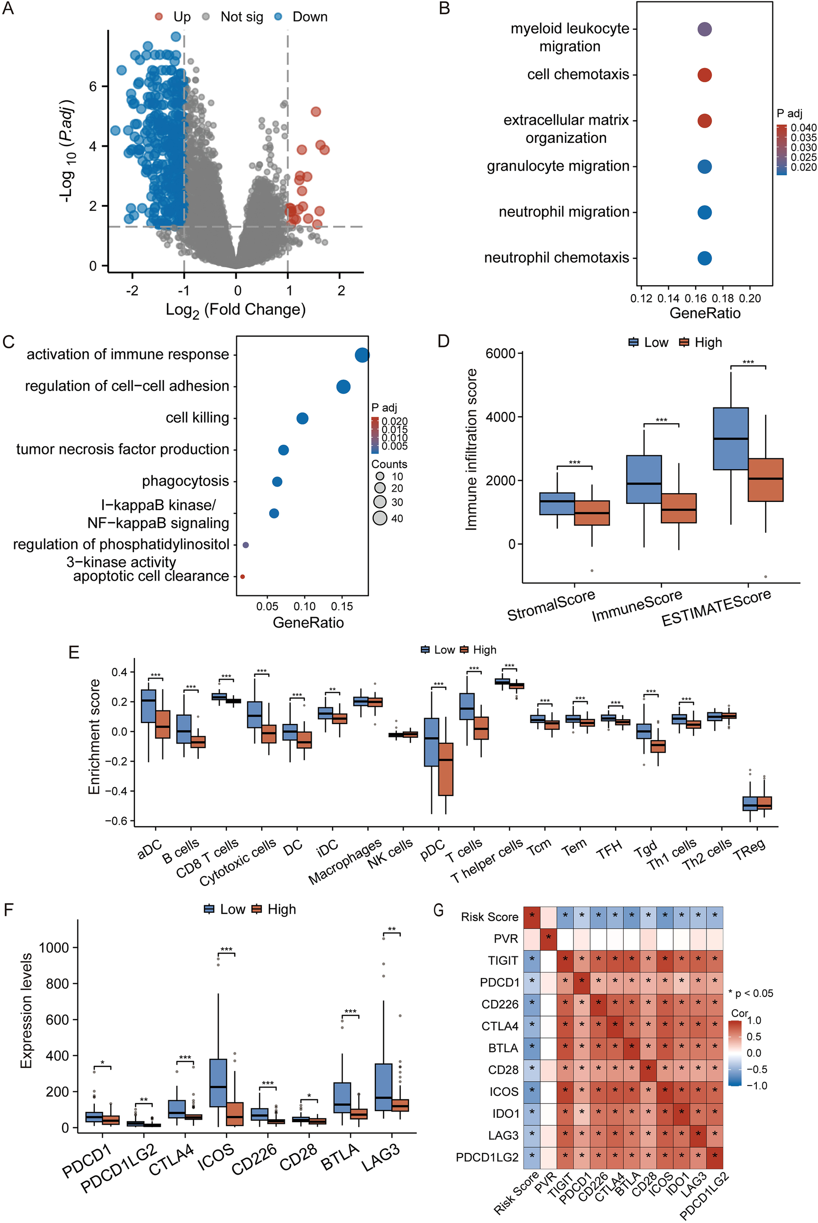 The prognostic signature reflects the tumor immune microenvironment. (A) Volcano plot of DEGs between high- and low-risk groups. Red and blue dots represent up- and down-regulated genes, respectively. Genes with an adjusted p-value ≤ 0.05 and |log2(Fold Change)| >1 are considered significant. (B, C) GO and KEGG enrichment analysis of genes upregulated in the high-risk (B) and low-risk (C) groups. (D) Comparison of Stromal, Immune, and ESTIMATE scores between risk groups. (E) ssGSEA analysis showing the relative enrichment of 28 immune cell subtypes. (F) Expression levels of key immune checkpoint genes in high- and low-risk groups. (G) The heatmap shows the correlation between the prognostic risk score and the expression level of immune checkpoint genes. Data in (D-F) are presented as box plots. *p < 0.05, **p < 0.01, ***p < 0.001 (Student’s t-test).