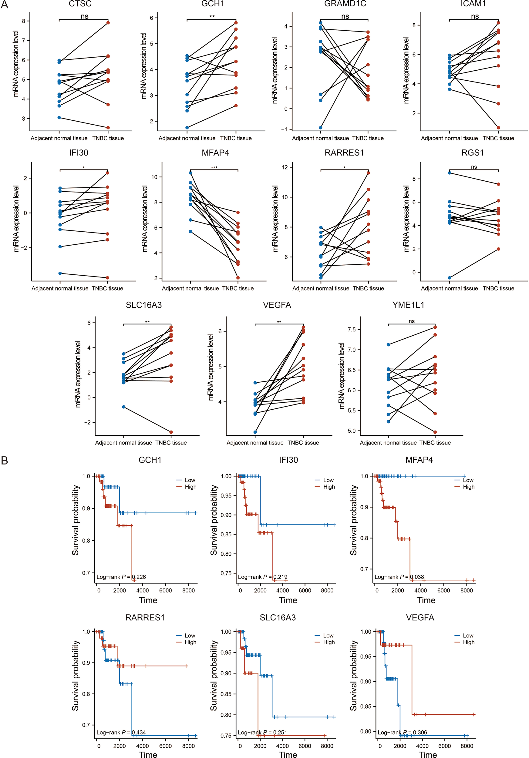 Identification of MFAP4 as the key prognostic gene. (A) Expression levels of the 11 signature genes in paired TNBC and adjacent normal tissues from the TCGA-BRAC dataset. (B) Kaplan-Meier survival analysis for six selected genes in the TCGA-TNBC cohort. Paired Student’s t-test (A) and log-rank test (B) were used. ns, not significant. *p < 0.05, **p < 0.01, ***p < 0.001; ns, not significant.
