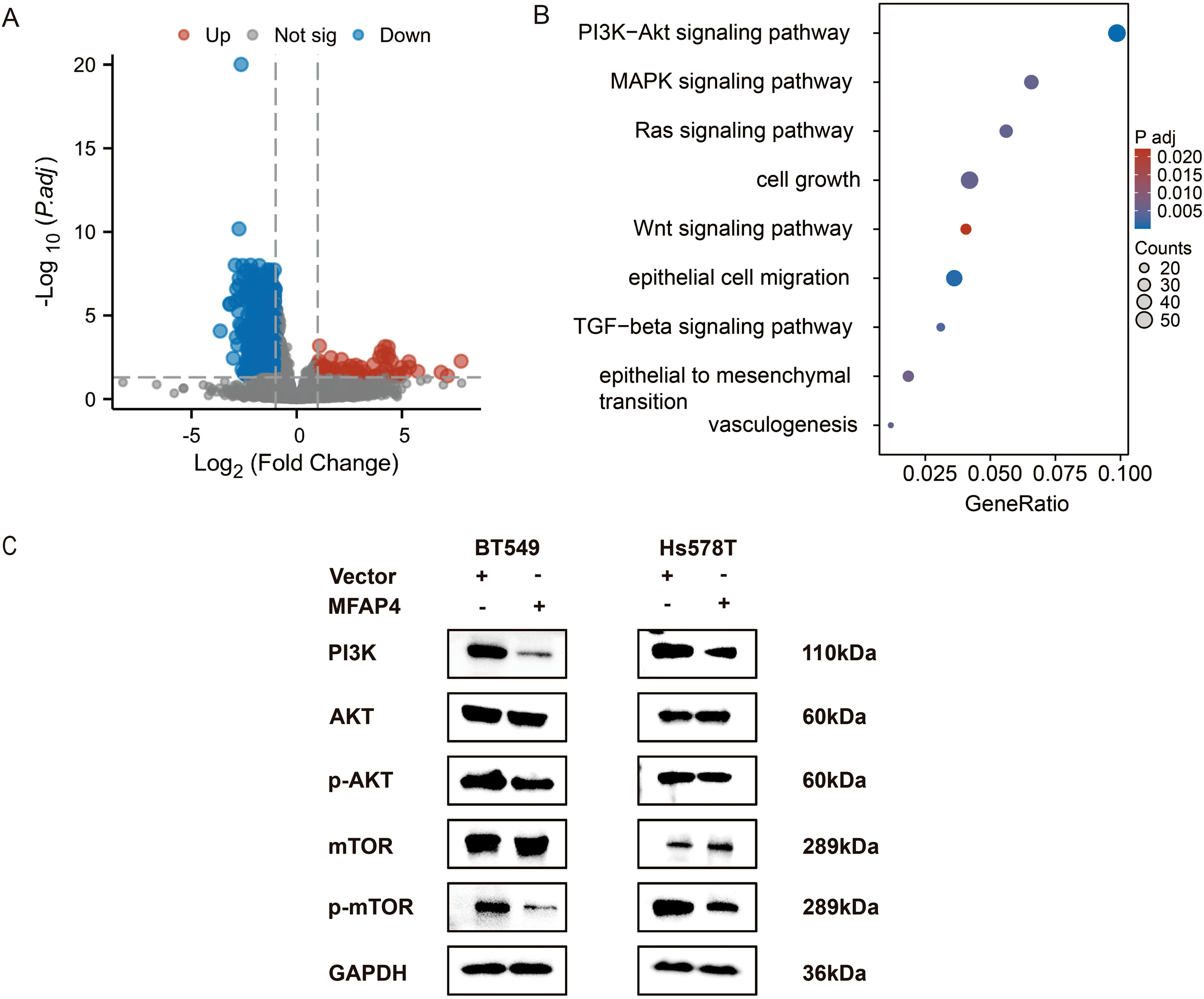 MFAP4 negatively regulates the PI3K/AKT/mTOR pathway. (A) Volcano plot of DEGs between MFAP4-high and MFAP4-low expression groups in the TCGA-TNBC cohort. Red and blue dots represent up- and down-regulated genes, respectively. Genes with an adjusted p-value ≤ 0.05 and |log2(Fold Change)| > 1 are considered significant. (B) KEGG pathway analysis of the DEGs, highlighting the enrichment of the PI3K-AKT signaling pathway in the MFAP4-low group. (C) WB analysis showing the phosphorylation levels of key pathway components (PI3K, AKT, p-AKT, mTOR, p-mTOR) in MFAP4-overexpressing vs. vector control BT-549 and Hs-578T cells. GAPDH served as a loading control.