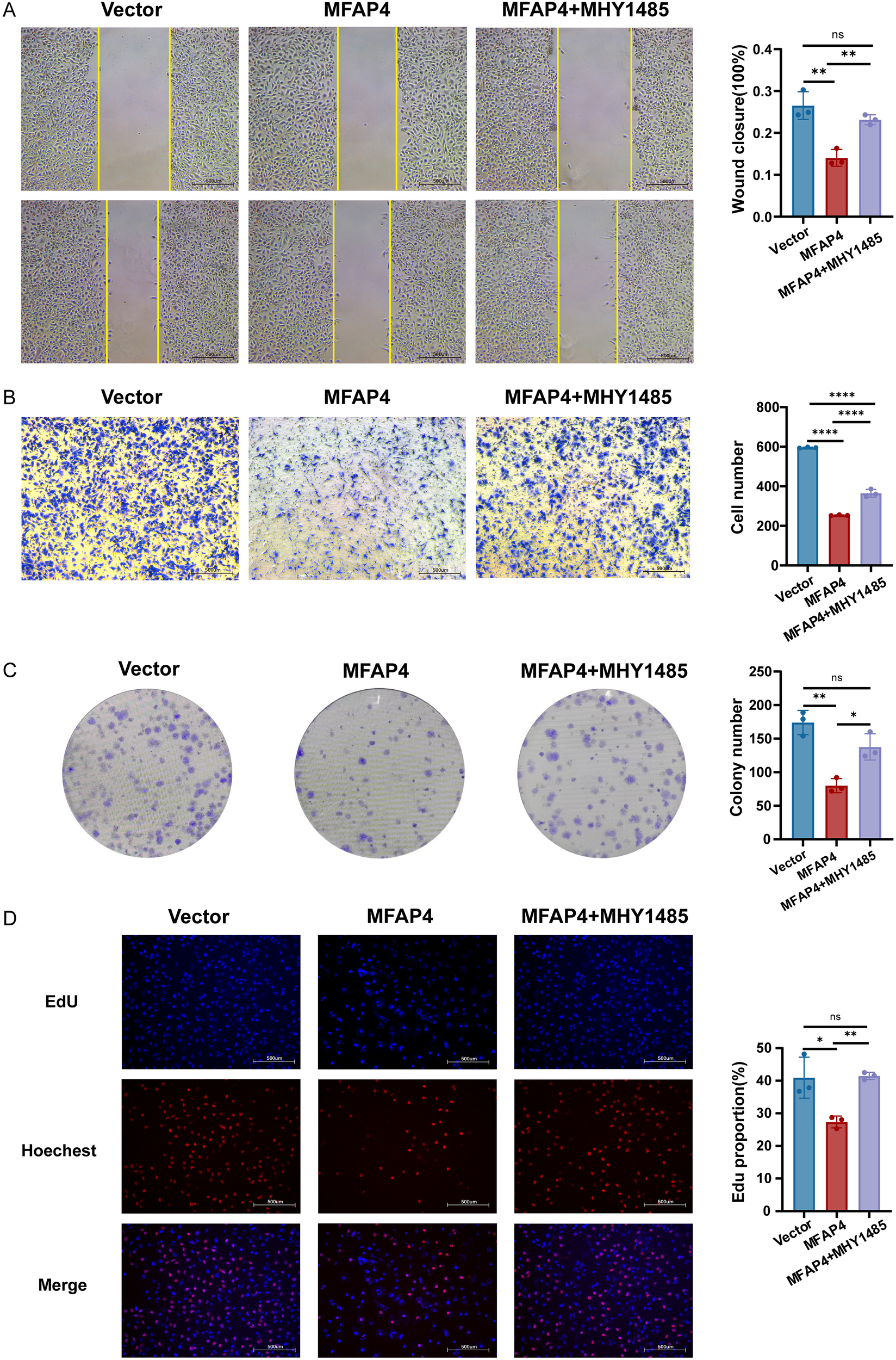Pharmacological activation of mTOR rescues the anti-tumor effects of MFAP4. Hs-578T cells (Vector or MFAP4-overexpressing) were treated with vehicle or mTOR agonist MHY1485 (3 μM) for 24 (h) (A) Wound healing and (B) Transwell assays showing reversal of migration inhibition. Scale bar, 500 μm. (C) Colony formation and (D) EdU assays showing reversal of proliferation suppression. Scale bar, 500 μm. Data are expressed as mean ± SD. Each data point in the statistical graph represents an independent repeated experiment, with n=3 independent experiments. *p < 0.05, **p < 0.01, ****p < 0.0001, ns, not significant (One-way ANOVA with Tukey’s post hoc test).