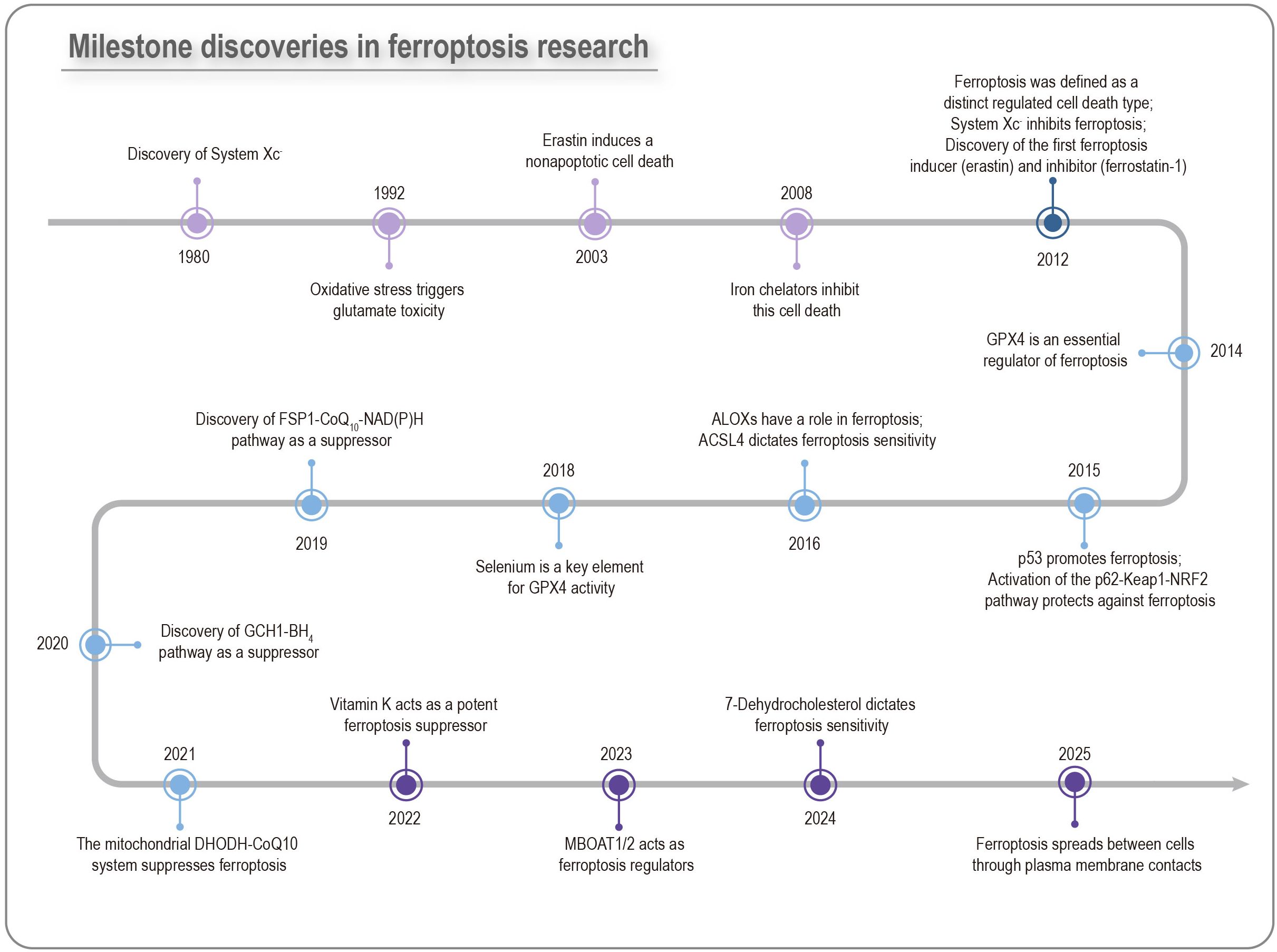 Figure 1. Milestone discoveries in ferroptosis research. The key ferroptosis-associated membrane protein xCT was identified as early as the 1980s. After more than two decades of investigation, the canonical ferroptosis inducers erastin and RSL3, which were found to trigger cell death in RAS-mutant BJELR cells, were reported in 2003 and 2008, respectively. However, it was not until 2012 that Dixon and colleagues formally defined this process as ferroptosis. Since then, ferroptosis has surged to the forefront of research, bringing multiple major advances.