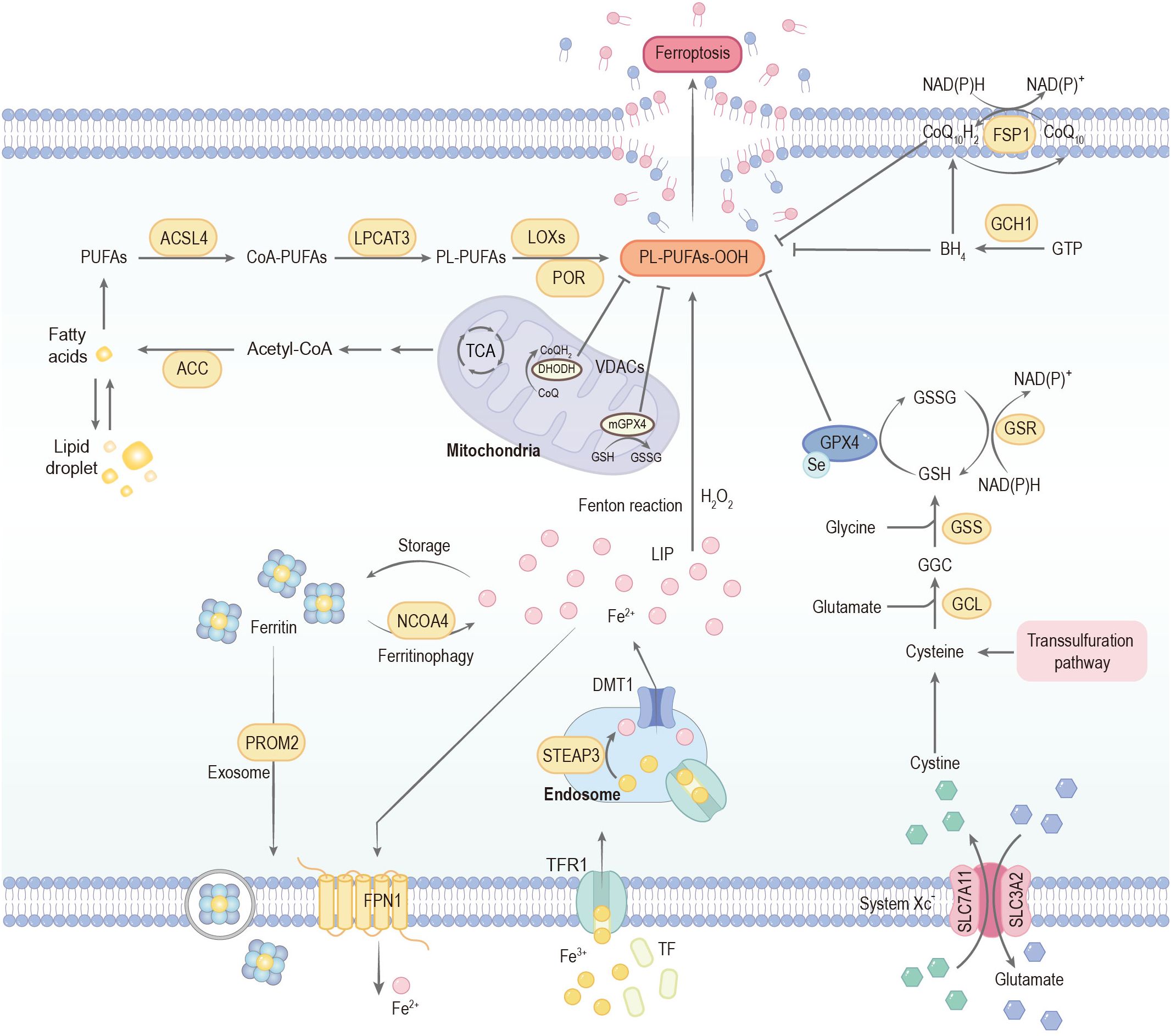 Figure 2. Mechanisms governing ferroptosis. Ferroptosis is predominantly driven by iron-dependent lipid peroxidation. Extracellular iron is primarily bound to transferrin (TF) and internalized into endosomes via transferrin receptor 1 (TfR1). Within the endosomal compartment, the acidic microenvironment maintained by proton pumps facilitates the reduction of Fe3+ to Fe2+, a reaction catalyzed by six-transmembrane epithelial antigen of prostate 3 (STEAP3). The reduced Fe2+ is subsequently transported into the cytoplasm through divalent metal transporter 1 (DMT1), thereby contributing to the formation of the labile iron pool (LIP). Cytoplasmic iron homeostasis is tightly regulated: excess Fe2+ can be exported by the membrane protein ferroportin (FPN1) or sequestered in ferritin for storage. Notably, ferritin can undergo selective autophagic degradation mediated by nuclear receptor coactivator 4 (NCOA4), a process termed ferritinophagy, which releases stored iron into the LIP and consequently increases cellular susceptibility to ferroptosis. Acetyl-CoA carboxylase (ACC)-mediated fatty acid synthesis or lipophagy-mediated fatty acid release induces the accumulation of intracellular free fatty acids, which fuels ferroptosis. Long-chain acyl-CoA synthetase 4 (ACSL4) and lysophosphatidylcholine acyltransferase 3 (LPCAT3) promote the incorporation of polyunsaturated fatty acids (PUFAs) into phospholipids to form phospholipid-polyunsaturated fatty acids (PL-PUFAs). These PL-PUFAs are highly susceptible to peroxidation, occurring through enzymatic pathways mediated by lipoxygenases (LOXs) and cytochrome P450 oxidoreductase (POR), as well as non-enzymatic free radical–driven reactions, ultimately promoting ferroptotic cell death. The cystine/glutamate antiporter (System Xc-) mediates the uptake of cystine in exchange for glutamate at a 1:1 ratio. Once transported into the cell, cystine is reduced to cysteine, which serves as the rate-limiting precursor for glutathione (GSH) biosynthesis. This process proceeds through sequential enzymatic steps catalyzed by glutamate–cysteine ligase (GCL) and glutathione synthetase (GSS). Acting as a critical reducing cofactor, GSH enables glutathione peroxidase 4 (GPX4) to convert lipid hydroperoxides into their corresponding lipid alcohols, thereby preventing lethal lipid peroxidation and maintaining redox homeostasis. The FSP1–CoQ10 and GCH1–BH4 systems can also inhibit ferroptosis. CoA-PUFAs, coenzyme A-polyunsaturated fatty acids; PL-PUFAs-OOH, phospholipid-bound polyunsaturated fatty acid hydroperoxides; PROM2, prominin 2; GSSG, glutathione disulfide; FSP1, ferroptosis suppressor protein 1; CoQ10, coenzyme Q10; GTP, guanosine triphosphate; GCH1, GTP cyclohydrolase 1; BH4, tetrahydrobiopterin; TCA, tricarboxylic acid cycle; VDACs, voltage-dependent anion channels; CoQ10H2, ubiquinol.