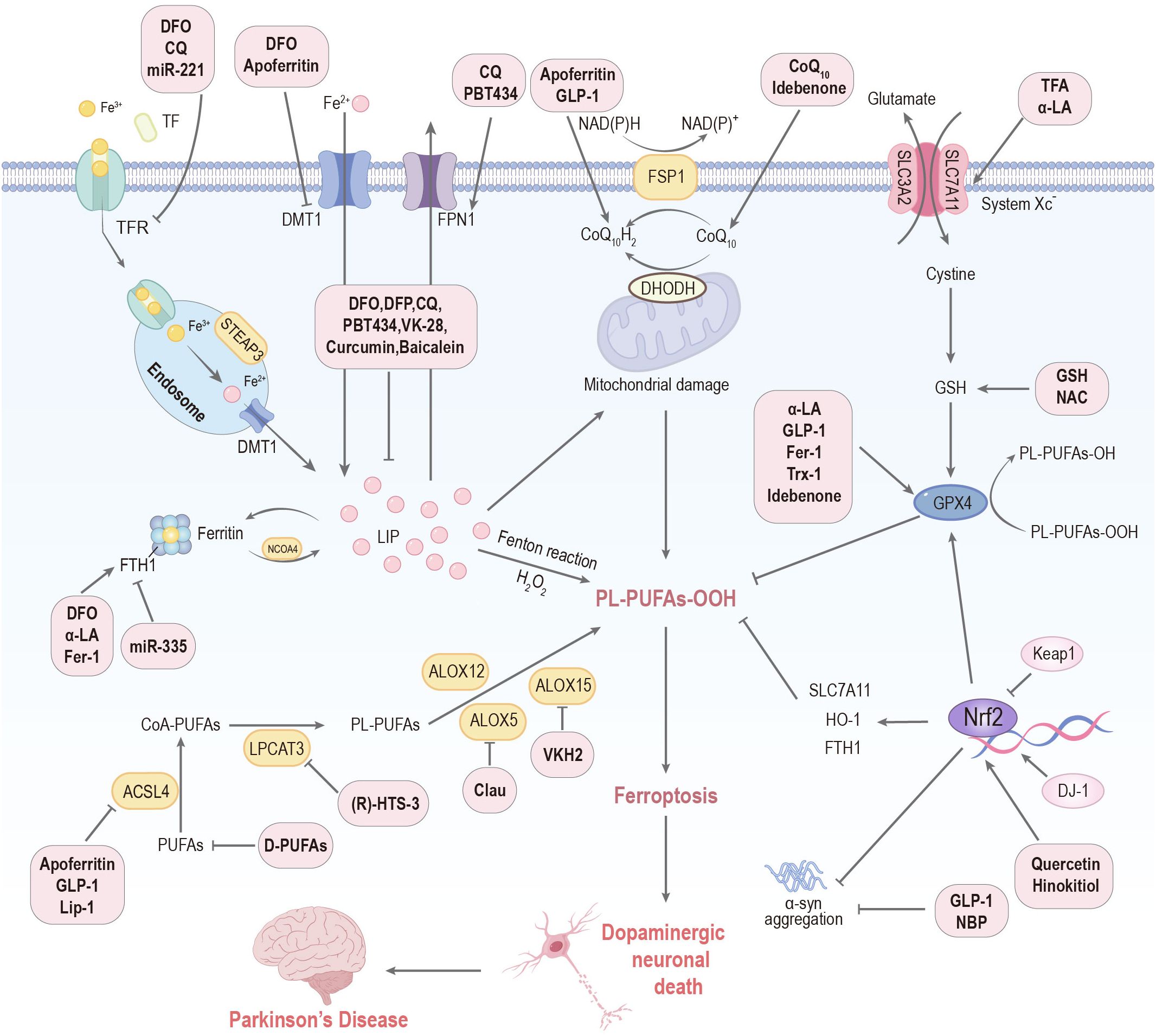 In this comprehensive review, we aim to summarize the multifaceted roles of ferroptosis in PD pathogenesis, elucidate the links between PD-associated pathogenic proteins and ferroptosis, and provide an overview of current clinical trials and the potential of ferroptosis in the early diagnosis and treatment of PD.