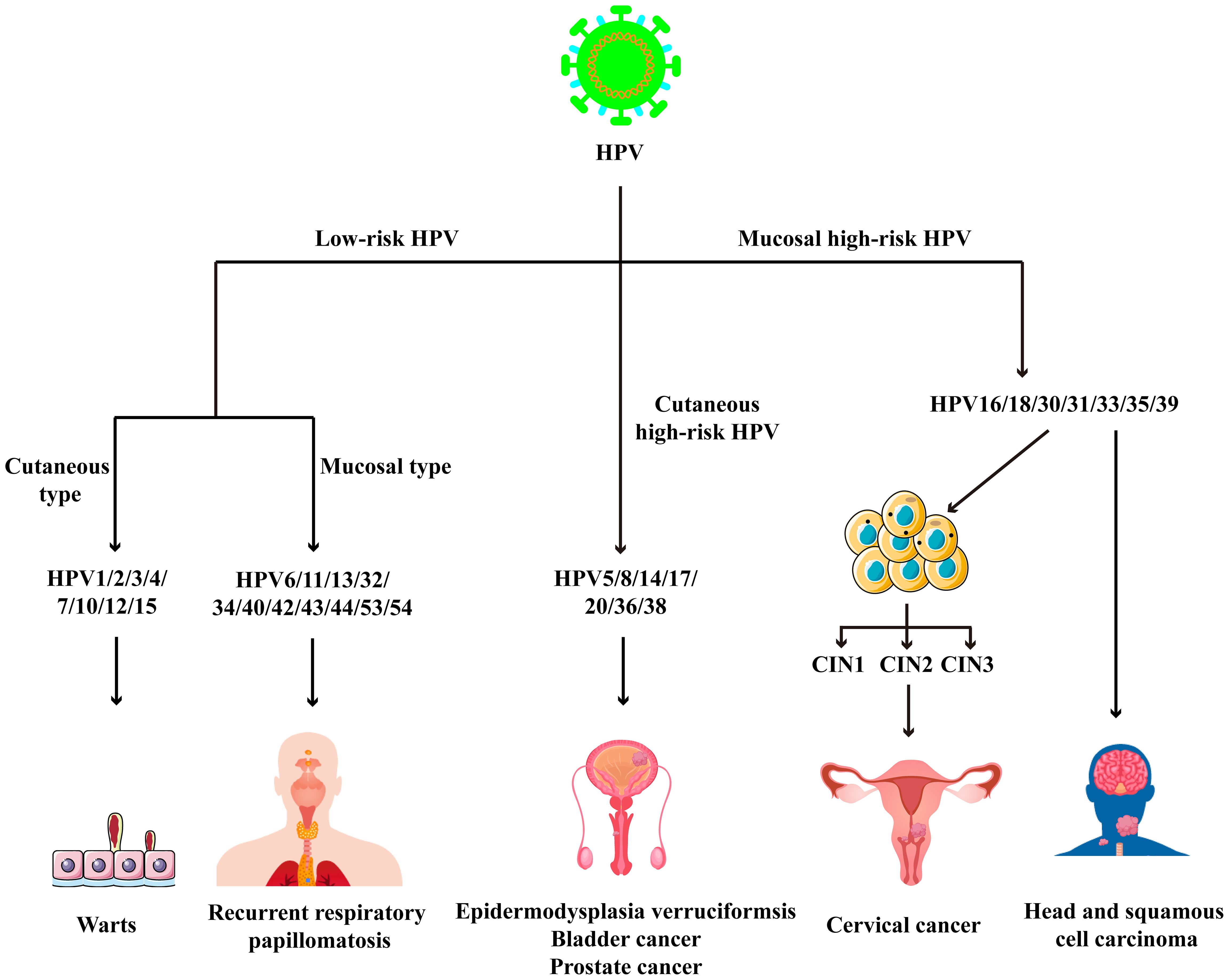 Human papillomavirus (HPV) is a small DNA virus that belongs to the Papillomaviridae family and poses a significant threat to global public health (1–3). Based on the disease outcomes, HPV strains are categorized into low-risk and high-risk types. Low-risk HPV types, such as HPV 6 and 11, are primarily associated with benign lesions, including genital warts and common warts (4). In contrast, high-risk HPV types, including HPV 16 and 18, are strongly linked to the pathogenesis of head and neck squamous cell carcinoma (HNSCC)and cervical cancer (Figure 1) (5). The innate immunity serves as the frontline against viruses, employing pattern recognition receptors (PRRs) to detect pathogen-associated molecular patterns (PAMPs). This recognition triggers the production of a wide array of cellular and molecular factors to counteract the viral infection (6, 7). Additionally, innate immunity also plays a pivotal role in HPV-related cancers (8, 9).