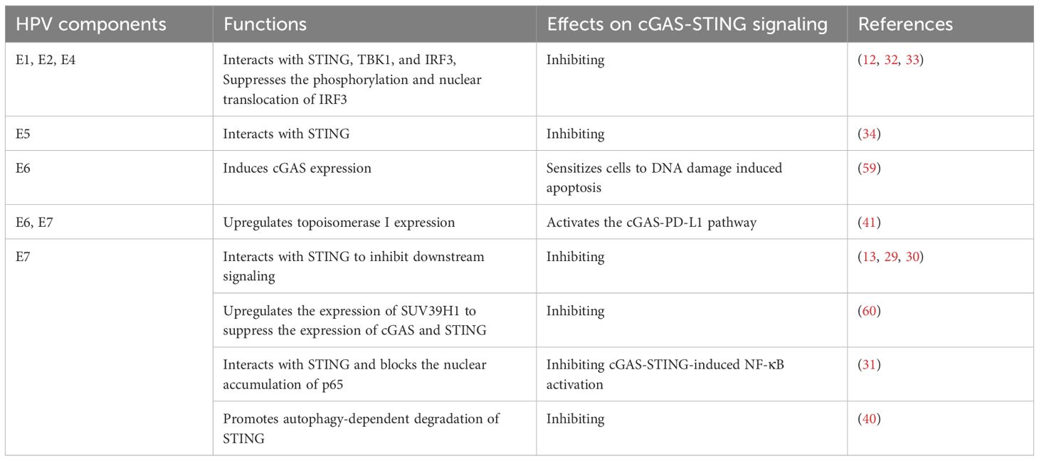 Hitherto, it has been clear that innate immunity holds a pivotal position in the development of infectious diseases, autoimmune diseases, and cancers. In the past few years, there has been a significant increase in interest and understanding surrounding the role of cGAS-STING signaling pathway in HPV-related diseases. For instance, HPV18 E7 bound to STING in a region critical for NF-κB activation and then blocked the nuclear accumulation of p65, suppressing the production of inflammatory cytokines (31). Moreover, E5 and E2 have also been reported to inhibit STING-mediated responses, resulting immune evasion (34, 35). Notably, studies pointed out that activation of STING inhibited cervical cancer tumor growth by enhancing the anti-tumor immune response (11). However, some studies confirmed the roles of cGAS-STING signaling in HPV-related cancer development through the upregulation of PD-L1 and expansion of Tregs, indicating the tumor-promoting effects of cGAS-STING activation under certain contexts (11, 47).