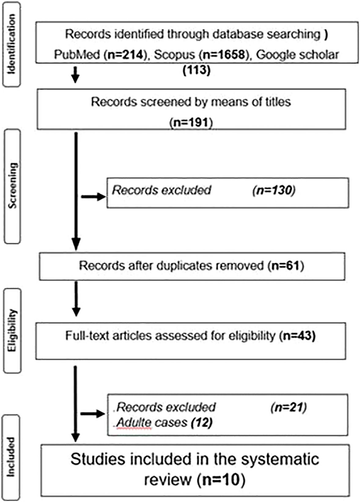 The initial search yielded 1985 papers. After title screens, 191 Records were identified through database searching; PubMed (n=52), Scopus (n=26), and Google Scholar (113). Then after abstract reading, 130 papers were excluded, and after duplicate removal, only 61 articles were retained. After full-text reading and authors’ concertation, only 21 articles were assessed for eligibility. Finally, after adult cases’ exclusion, only 9 cases were retained.