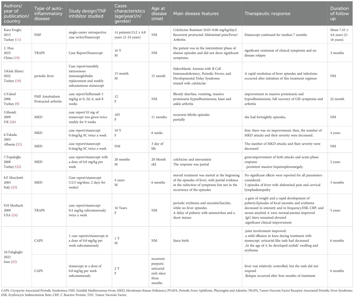 In the CAPS cases, specific subtypes were not clearly defined; however, clinical features suggested that one patient likely had Familial Cold Autoinflammatory Syndrome (FCAS), while the other had features suggestive of Neonatal-Onset Multisystem Inflammatory Disease (NOMID), including neurological symptoms such as papilledema. Etanercept was administered in 10 cases, though dosing regimens varied across studies: some used 0.4 mg/kg twice weekly, while others reported different frequencies or did not specify dosage. Infliximab was used in one FMF case (26). Follow-up durations, when reported, ranged from 3 months to 4 years, with rapid improvement observed in 4 cases. However, in one MKD/MKD case, recurrent episodes persisted despite combination therapy with anakinra and colchicine, with minor attacks occurring every 4–6 weeks (22). Another MKD/MKD case showed continued relapses until 4 months of treatment, after which attack frequency and severity declined (20). In contrast, one MKD/MKD case did not respond significantly to etanercept (23), and both CAPS cases showed only partial responses. Therapeutic outcomes varied by disease: Complete clinical and biological remissions were achieved in both TRAPS cases, with normalization of inflammatory markers (ESR, CRP, and serum amyloid A) and complete resolution of symptoms under etanercept therapy (20, 23). This consistent response contrasts with the more variable outcomes observed in other HRF subtypes, emphasizing the particular sensitivity of TRAPS to TNF inhibition. partial responses in three cases (one MKD/MKD and two CAPS (26)); and no significant response in six cases, including FMF and three MKD/MKD cases (21, 23). In one FMF report, outcome data were not provided. The lack of precise CAPS subtype classification (e.g., FCAS, Muckle-Wells syndrome, or NOMID) further limited interpretation of treatment responses. The results are summarized in Table 1.