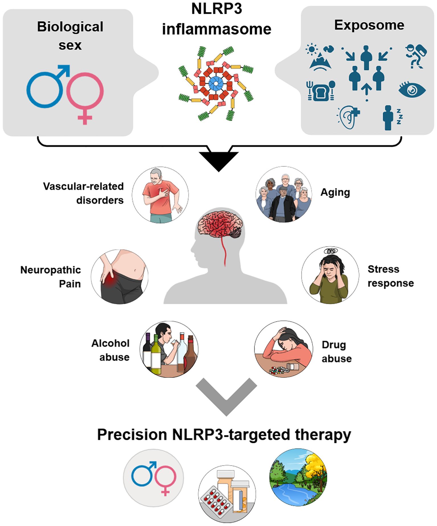 Graphical Abstract. The NLRP3 inflammasome emerges as a central hub at the intersection of biological sex and exposome influences, integrating genetic, hormonal, and lifestyle-related inputs. Its dysregulation contributes to multiple brain-related conditions, including vascular disorders, neuropathic pain, aging, stress responses, and substance abuse. Understanding these modulatory axes highlights opportunities for precision NLRP3-targeted therapies tailored to sex-specific and environmental determinants.