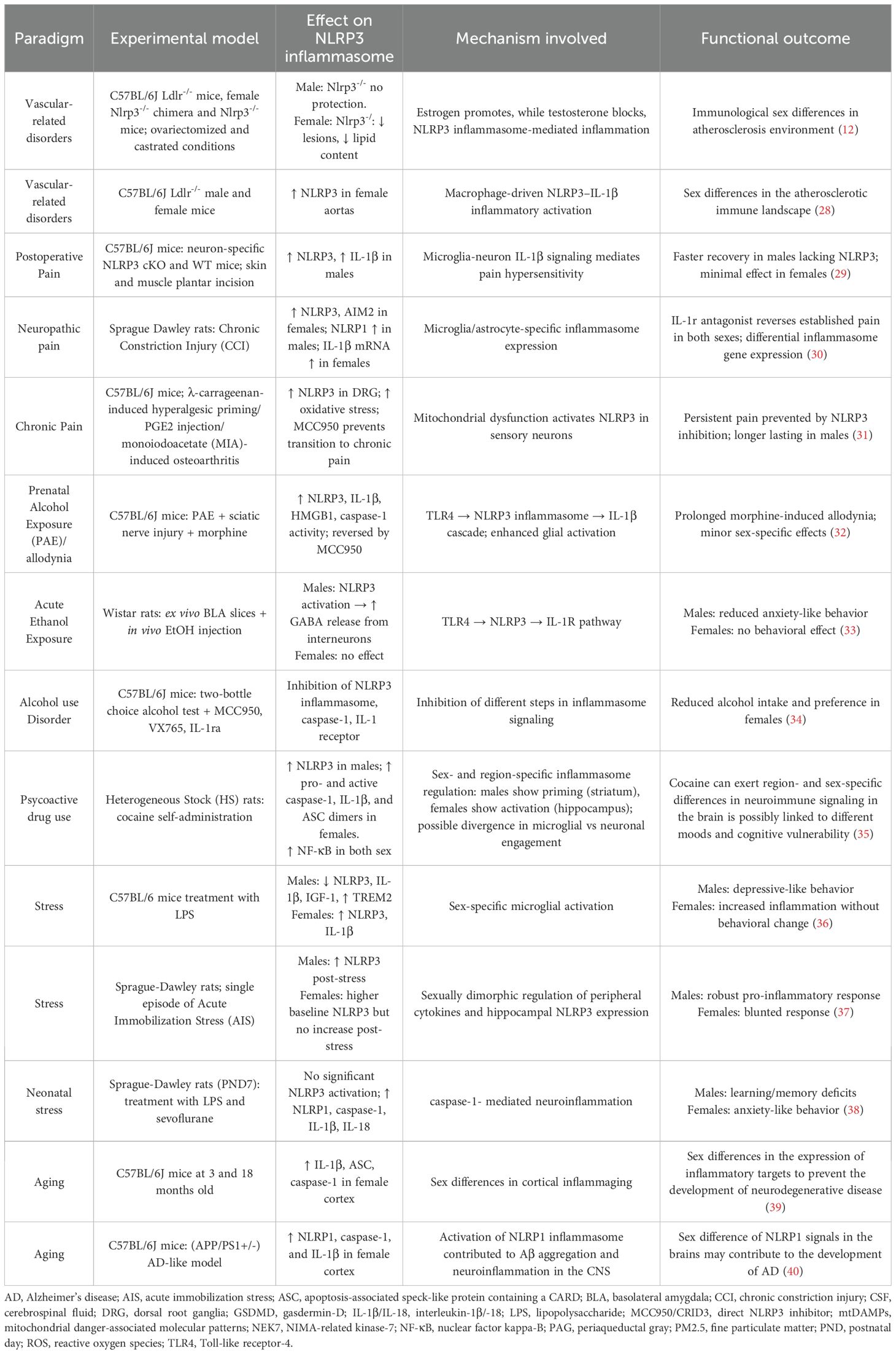 Sex differences in immune-inflammatory responses are increasingly recognized for their impact on health and disease. Biological sex shapes immune activity at peripheral and central levels across the lifespan through interaction among hormones, chromosomal factors, and environmental influences (16–19). Males and females differ in the magnitude and quality of inflammatory responses, including immune cell activation, signaling pathways, and downstream processes (20). These variations influence disease susceptibility, progression, and therapeutic outcomes (21–23). The NLRP3 inflammasome is emerging as a pathway modulated by sex hormones, which exert context-dependent effects and contribute to vulnerability or resilience in brain disorders (23–25). Sex-related differences in NLRP3 signaling are reported both at baseline and under inflammatory challenges, varying across tissues, developmental stages, and disease models (26, 27). The following section examines CNS related conditions where NLRP3 is crucial, focusing on in vivo evidence of sex-dependent differences in its expression and activity (Table 1).