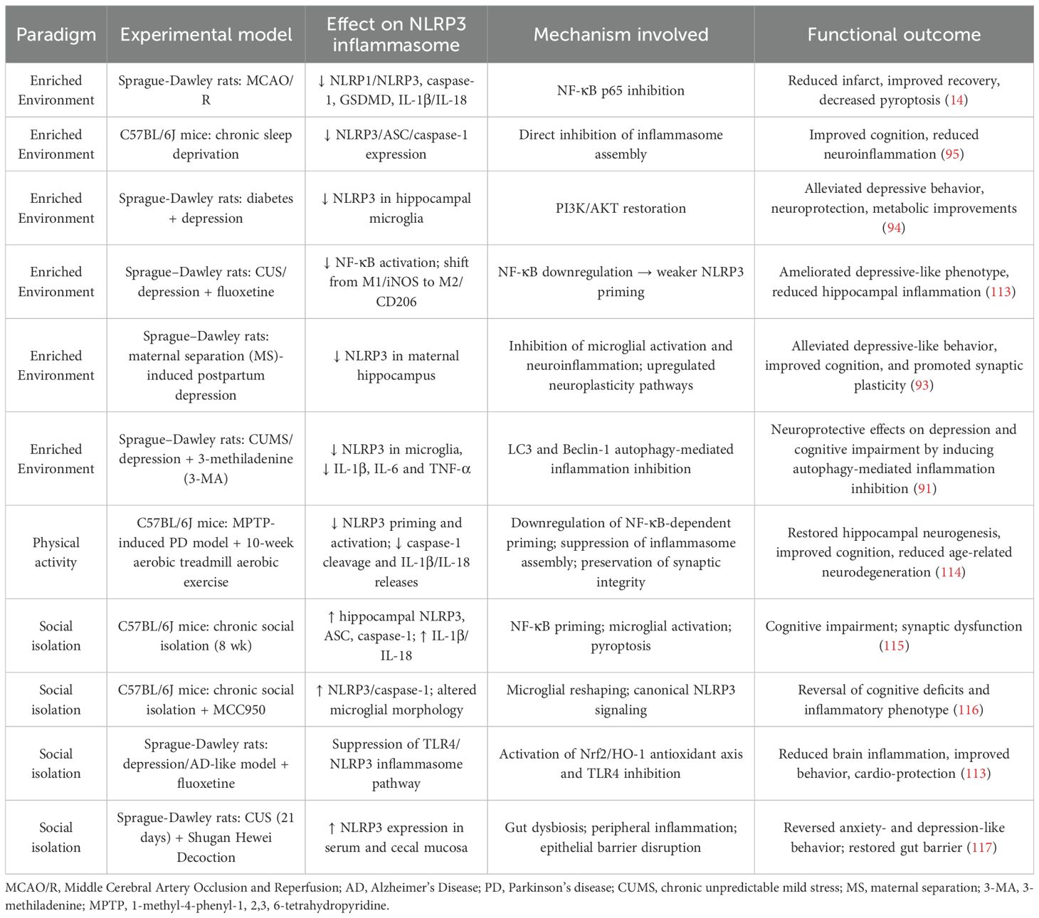 Environmental enrichment (EE), defined as enhanced sensory, cognitive, and physical stimulation beyond ordinary living conditions, promotes brain function and resilience by promoting neurogenesis, synaptic plasticity, and cognition (118). Preclinical EE paradigms provide larger housing with toys, wheels, tunnels, climbing structures, and social interaction with frequent novelty (89, 119). Compared with standard housing, EE fosters neuroplasticity, dendritic branching, and hippocampal synaptogenesis (89, 90, 120), while also influencing metabolic, endocrine, and immune processes (92, 121, 122). In contrast, impoverished settings with reduced activity and stimulation enhance microglial NLRP3 activation, exacerbating neuroinflammation and pathology (113, 115, 116). Conversely, enriched contexts dampen NLRP3-driven inflammation and improve behavioral and cognitive resilience, highlighting EE as a regulator of inflammasome signaling across conditions (89, 90, 123, 124). Environmental factors regulate NLRP3 activity, by influencing its priming and activation and integrating lifestyle inputs that shape immunometabolic and stress-response pathways (15, 94, 122). Converging preclinical evidence indicates that EE attenuates NLRP3 signaling and downstream inflammation across distinct pathophysiological contexts (Table 2).